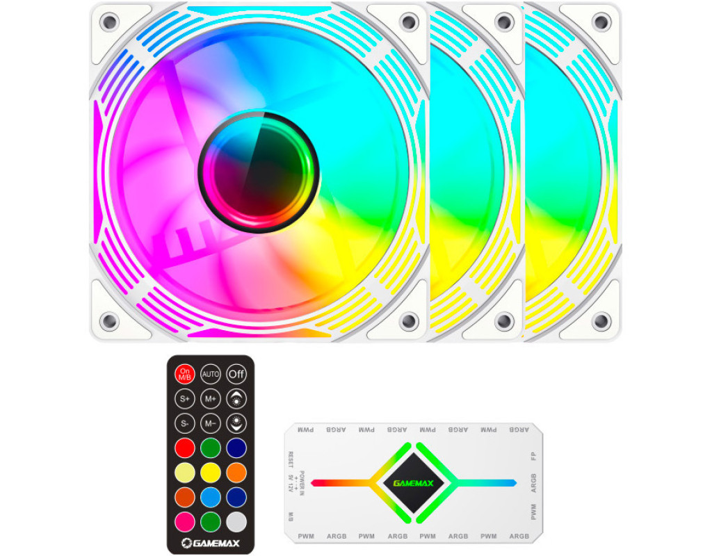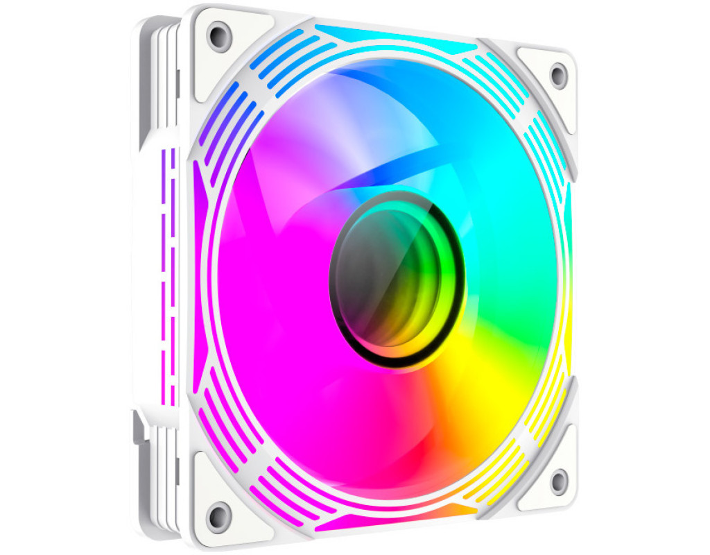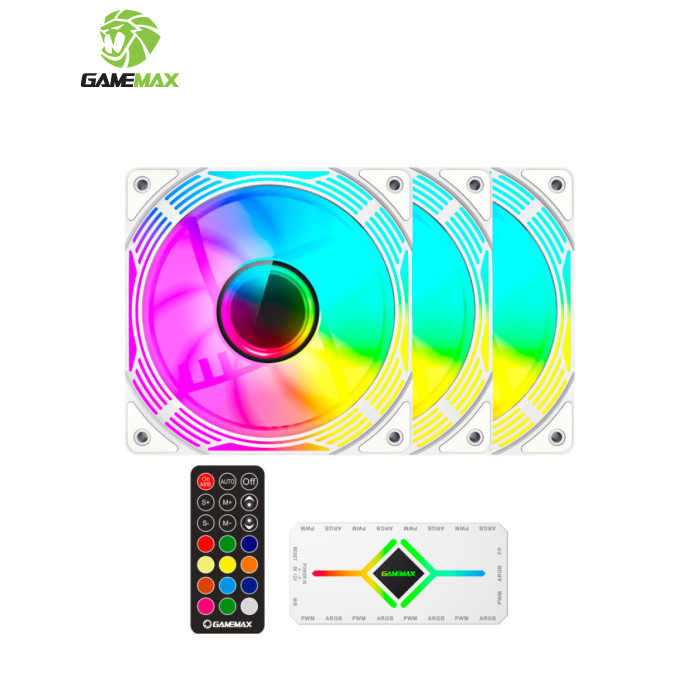 3 повнофункціональні 120-мм вентилятори ARGB PWM. Інтелектуальна температура контролює швидкість на рівні 800~1600±10% обертів за хвилину, підключаючись до 4-контактного роз’єму PWM на материнській платі, тому швидкість вентилятора автоматично контролюється та забезпечує тиху роботу вентиляторів. Ці вентилятори являють собою 3-контактні роз’єми ARGB на 5 В, які один за одним з’єднуються з ХАБом керування ARGB.