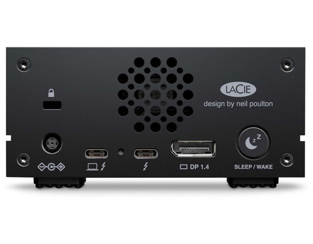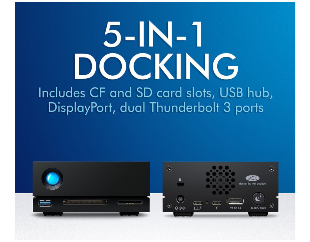 Док-станція 1big ємністю 4 ТБ від LaCie була розроблена як епіцентр робочих процесів у форматі 4K. Він поєднує в собі 3,5-дюймовий жорсткий диск Seagate IronWolf Pro 7200 об/хв SATA, що забезпечує швидкість передачі даних до 280 МБ/с, два порти Thunderbolt 3, порт USB 3.0 Type-A, вихід DisplayPort 1.4 для 8K/60 Гц , Відео 4K / 120 Гц, 1080p та 720p, а також слоти для карт пам'яті SD та CompactFlash. Завдяки алюмінієвому корпусу та терморегульованому вентилятору робочі температури залишаються низькими. У той час як один з портів Thunderbolt 3 використовується для підключення 1big Dock до вашої сумісної системи, що працює як мінімум на Windows 10 або MacOS 10.12, інший можна використовувати для послідовного підключення до шести додаткових пристроїв або забезпечення до 70 Вт потужності заряджання. У комплект LaCie 1big Dock ємністю 16 ТБ входять кабель Thunderbolt 3 40 Гбіт/с, кабель USB 3.0 та зовнішній блок живлення. |