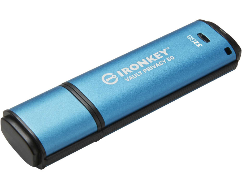 Kingston IronKey Vault Privacy 50 - це накопичувачі преміум-класу з інтерфейсами USB Type-A, що забезпечують безпеку корпоративного рівня завдяки 256-бітовій апаратній шифровці AES, сертифікованій за стандартом FIPS 197, у режимі XTS, включно з захистом від BadUSB з цифровим підписом, прошивкою та захистом від перебору паролів. VP50 пройшов тест на проникнення (випробування на проникнення) для забезпечення безпеки корпоративного рівня. Оскільки він забезпечує зашифроване сховище під фізичним контролем користувача, серія VP50 перевершує використання Інтернету та хмарних сервісів для захисту даних.