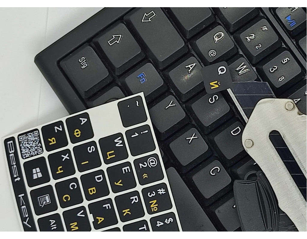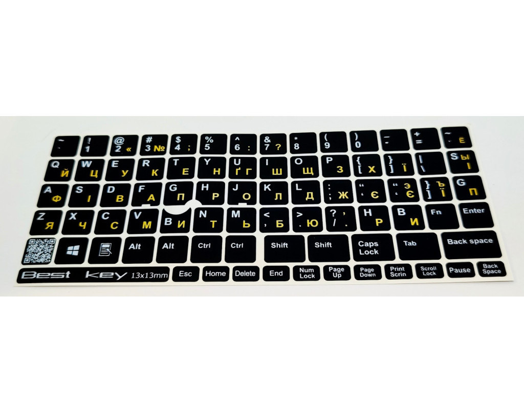 Наклейка на клавіатуру Best key універсальна 13х13мм. Наклейка на клавіатуру універсальна непрозора. Виготовлена по спеціальній технології яка забезпечує не стирання літер. Основа матова схожа з пластиком клавіш. Підходить для клавіатур з Point Stick. В наклейках є 76 клавіші розміром 13х13 мм. які виготовлені з м’якої ПВХ плівки. |