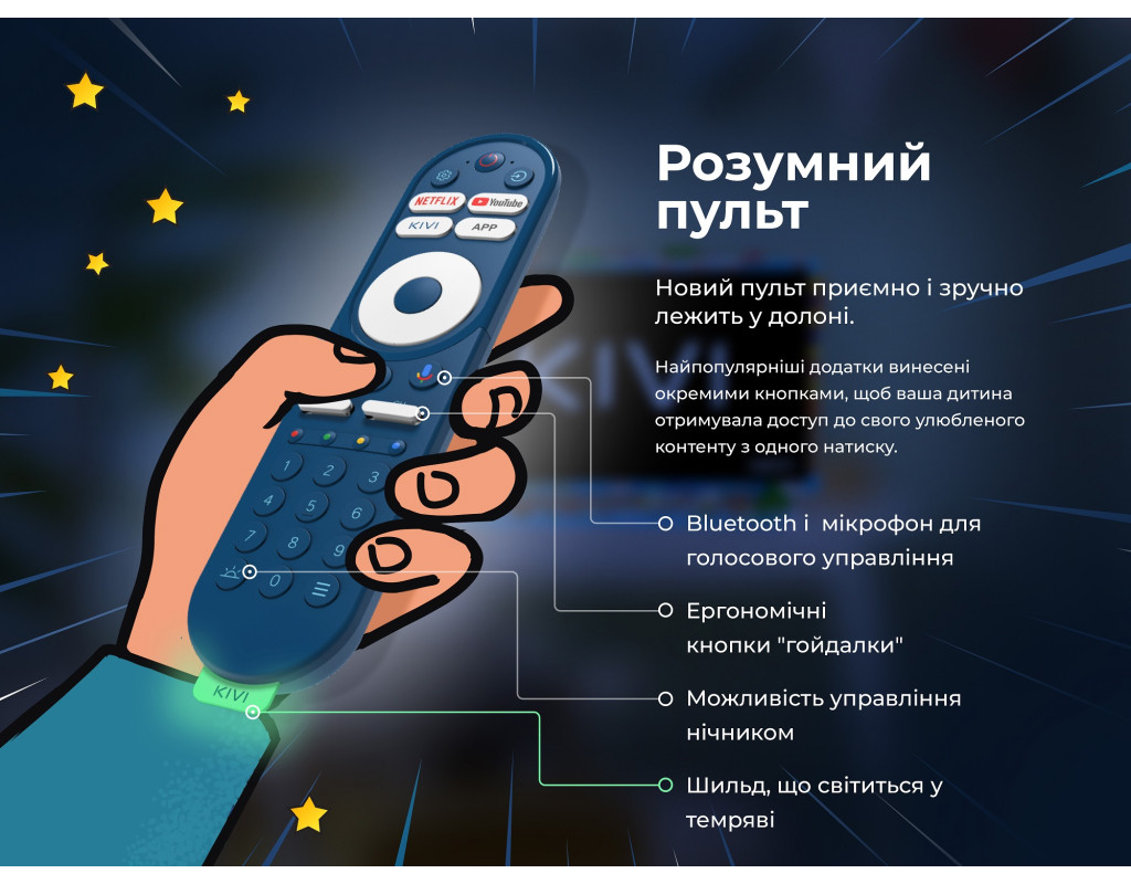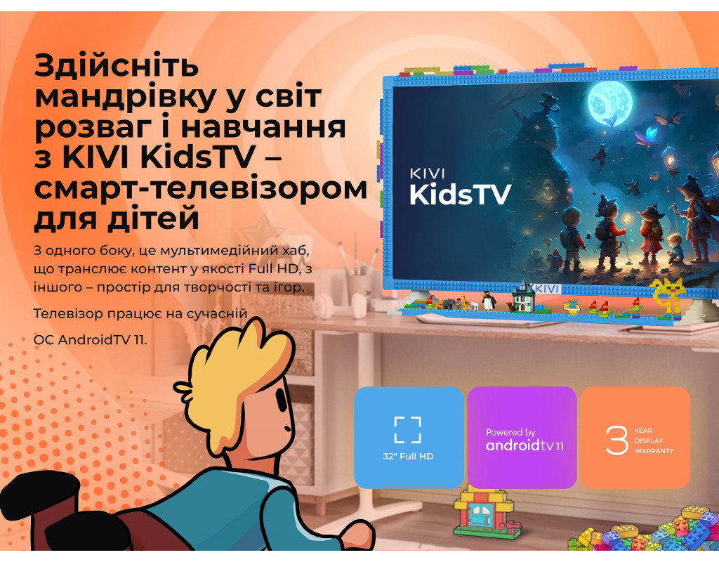 З унікальним дизайном у стилі конструктора креативно прикрасьте своє ТБ, розвиваючи уяву та розкриваючи творчий потенціал вашої дитини. Тепер смарт-телевізор стає частиною гри. З одного боку, це мультимедійний розважальний хаб, що транслює контент у якісному та яскравому малюнку Full HD, з іншого – простір для творчості та самовираження, а також частина дитячої гри. З KIVI KidsTV батьки будуть спокійні, адже дитина оточена безпечними для неї пристроями і дивиться відповідний віку контент. Не потрібно турбуватися через телевізор – захисне скло на екрані та надійна система фіксації ТБ до місця встановлення збереже техніку під час випадкового «краш-тесту», якщо дитячі ігри зайдуть надто далеко. Brick-Style design Щоразу дитина може створювати унікальну рамку, яка відображатиме її індивідуальність. ТБ сумісний з найпопулярнішими серіями конструкторів - ви можете використовувати вже наявний у дитини набір або придбати новий з будь-якої тематики. На рамку телевізора, підставки та центральну плашку KIVI KidsTV можна прикріплювати пластикові блоки конструкторів. Будуйте будь-що в будь-якому місці рамки - ніяких обмежень за розмірами, формами або кольорами. Protective glass 32-дюймовий Full HD екран нового KIVI KidsTV захищений загартованим склом. Міцне та стійке до подряпин, воно забезпечує оптимальний захист екрана, наприклад, при попаданні важкої іграшки, книги, навіть м'яча. Скло не боїться порізів гострими предметами, кігтів домашніх тварин, металевої блискавки на одязі або заряджання кабелю від телефону. ТБ абсолютно безпечний для дитини і буде радувати яскравою картинкою протягом багатьох років. Надійна фіксація ніжок Ніжки телевізора прикріплені безпосередньо до металевого каркаса та з'єднані між собою горизонтальною плашкою. Ця велика сполучна плашка служить додатковим полем для креативу, адже використовується для кріплення конструктора, як і вся рамка. У комплекті передбачено набір двосторонніх стікерів, щоб батьки змогли надійно приклеїти телевізор до поверхні, на якій він стоятиме. Нічник для міцного сну без страхів На задній панелі KIVI KidsTV розташований нічник AlumiGlow, що випромінює м'яке заспокійливе світло. Він створює у дитячій кімнаті затишну атмосферу та допомагає дітям швидше засинати, особливо якщо вони не люблять спати у темряві. Нічник може працювати навіть коли телевізор вимкнено. Рівень яскравості світла регулюється – батьки (або дитина) можуть налаштувати світильник за допомогою телевізійного пульта або кнопки на корпусі телевізора. Операційна система ТБ працює під управлінням сучасної ОС AndroidTV 11. Це офіційна сертифікована операційна система від Google, що гарантує високу швидкість і стабільну роботу смарт-телевізора. AndroidTV 11 надає доступ до 10 000+ ігрових, навчальних та розвиваючих програм. ОС дозволяє також керувати пристроєм за допомогою голосових команд, що є актуальним для найменших користувачів, які ще не знають букв, але можуть говорити. Також AndroidTV 11 має широкі можливості для налаштування батьківського контролю за контентом. Зручний пульт Обновлений пульт KIVI має ергономічний дизайн з мінімальною кількістю кнопок, щоб з керуванням Smart TV впоралася навіть дитина. Новий пульт приємно та зручно лежить у руці, а у кнопок плавний та тихий хід. Найпопулярніші програми винесені на пульт окремими кнопками, щоб глядач отримував доступ до улю