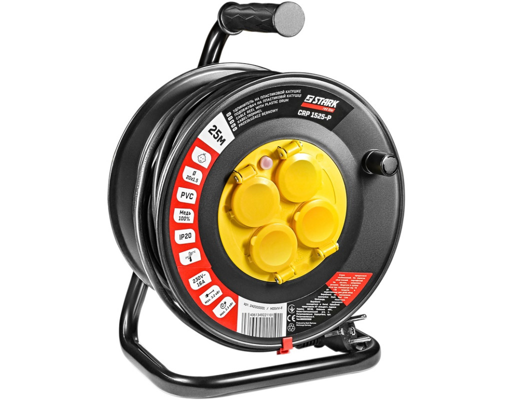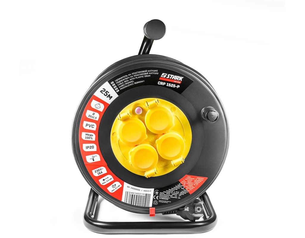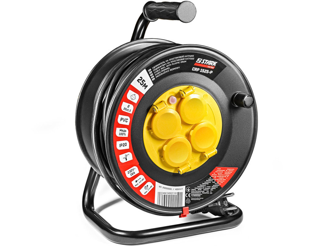 Подовжувач на котушці призначений для підключення широкого спектру електро- і садового інструменту до мережі змінного струму, а також пристроїв в місцях віддалених від стаціонарних розеток в побутових умовах експлуатації. Корпус виконаний з міцного пластику і оснащений гумовою рукояткою для перенесення. Кабель виконаний з 100% міді в міцної ПВХ обмотці з індексом H05VV. Може використовуватися поза приміщенням, при різних погодних умовах в температурному режимі 5С ° ... + 40С °. Має захист від дітей. Подовжувач оснащений 4 розетками євростандарту і має клас захисту IP20. Сертифікований і відповідає європейським стандартам. |