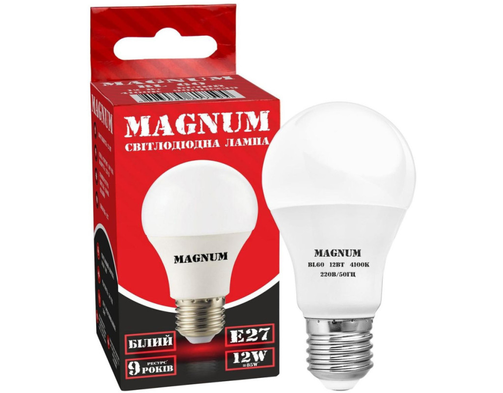 MAGNUM BL 60 12 Вт 4100K 220В E27 (90020657) — це світлодіодна лампа, призначена для загального освітлення, яка забезпечує нейтральне біле світло. Основні характеристики: