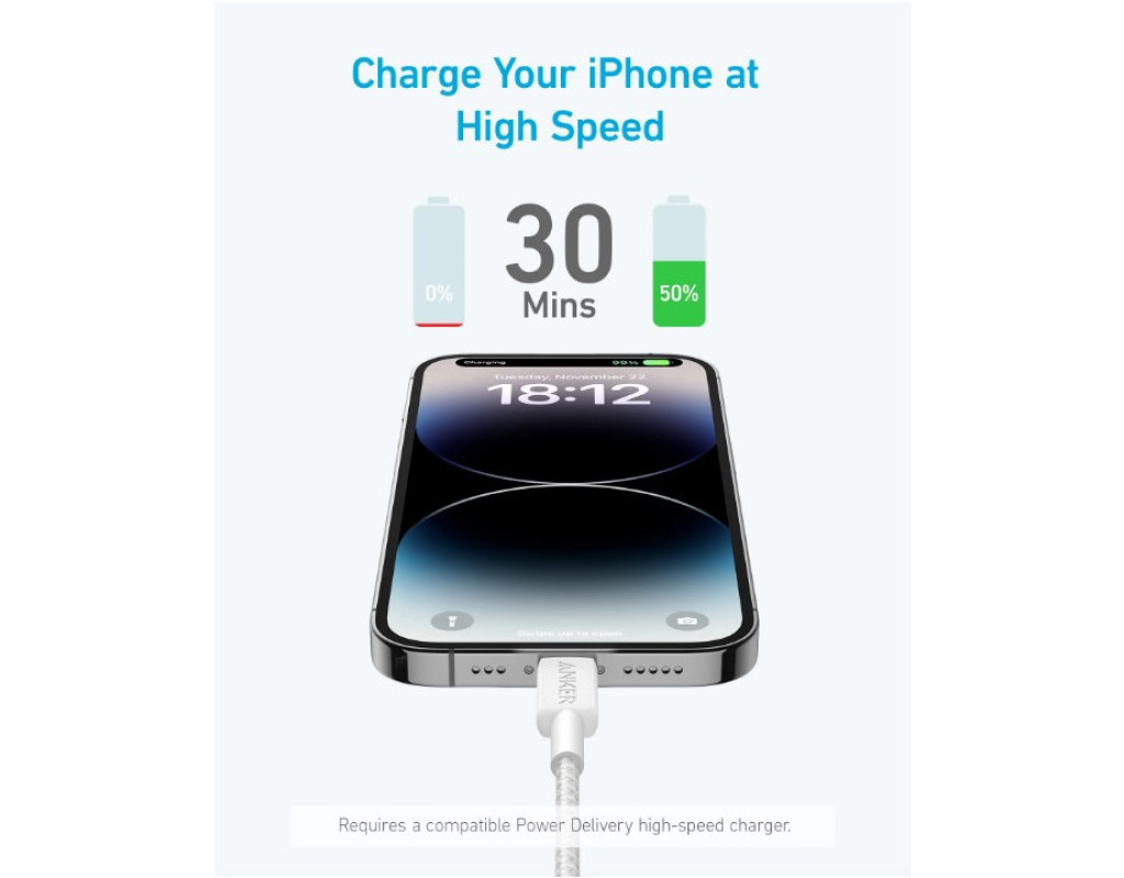 Зарядіть свій iPhone на 50% всього за 30 хвилин, використовуючи сумісний зарядний пристрій Power Delivery USB-C (не входить у комплект).
