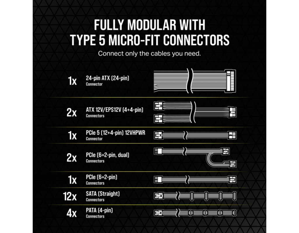 Повністю модульні блоки живлення серії Corsair RMx Shift мають революційний бічний кабельний інтерфейс, на який подано заявку на отримання патенту, що дозволяє тримати всі підключення в межах легкої досяжності, забезпечуючи винятково зручне живлення з ефективністю 80 PLUS Gold. Бокові з'єднання Інноваційна бічна панель БЖ з модульними роз'ємами, на яку подано заявку на отримання патенту, дозволяє зручно під'єднувати кабелі до бічної панелі БЖ, що спрощує підключення та керування кабелями, як ніколи раніше. Сертифіковано за стандартом ATX 3.0 Стандарт ATX 3.0 вимагає високого рівня надійності та енергоефективності. Хоча багато БЖ Corsair відповідають цим вимогам, БЖ серії RMx SHIFT офіційно сертифіковані на відповідність стандарту ATX 3.0. До комплекту входять графічні кабелі PCIe 5.0 12VHPWR для використання з сучасними відеокартами, такими як NVIDIA® GeForce RTX 40 Series. Роз'єми Corsair типу 5 micro-fit Повністю модульні кабелі для блоків живлення Corsair Type 5 Gen 1 micro-fit, тому ви можете підключати тільки ті кабелі, які потрібні вашій системі, займаючи при цьому менше місця. 140-мм вентилятор з підтримкою режиму нульових обертів 140-мм вентилятор на гідродинамічних підшипниках з низьким коефіцієнтом тертя та підтримкою режиму нульових обертів забезпечує прохолодну роботу вашого БЖ, залишаючись практично безшумним, якщо він не працює під високим навантаженням. Сертифіковано 80 plus gold Стабільна вихідна потужність з ефективністю до 90% і сертифікат Cybenetics за низьке енергоспоживання, менший рівень шуму та нижчу температуру. Конденсатори, розраховані на 105°C Виготовлений зі 100% японських електролітичних конденсаторів промислового класу, розрахованих на 105°C, для стабільної потужності та надійності. |