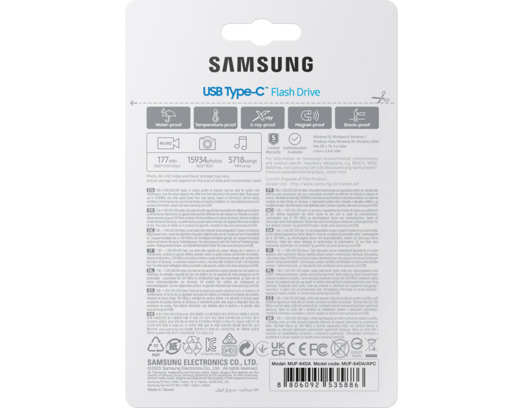 | Накопичувач Samsung 64GB USB 3.2 Type-C є портативним засобом зберігання даних ємністю 64 ГБ і інтерфейсом USB Type-C. Він пропонує швидкість передачі даних та зручне підключення до пристроїв, сумісних з Type-C. |