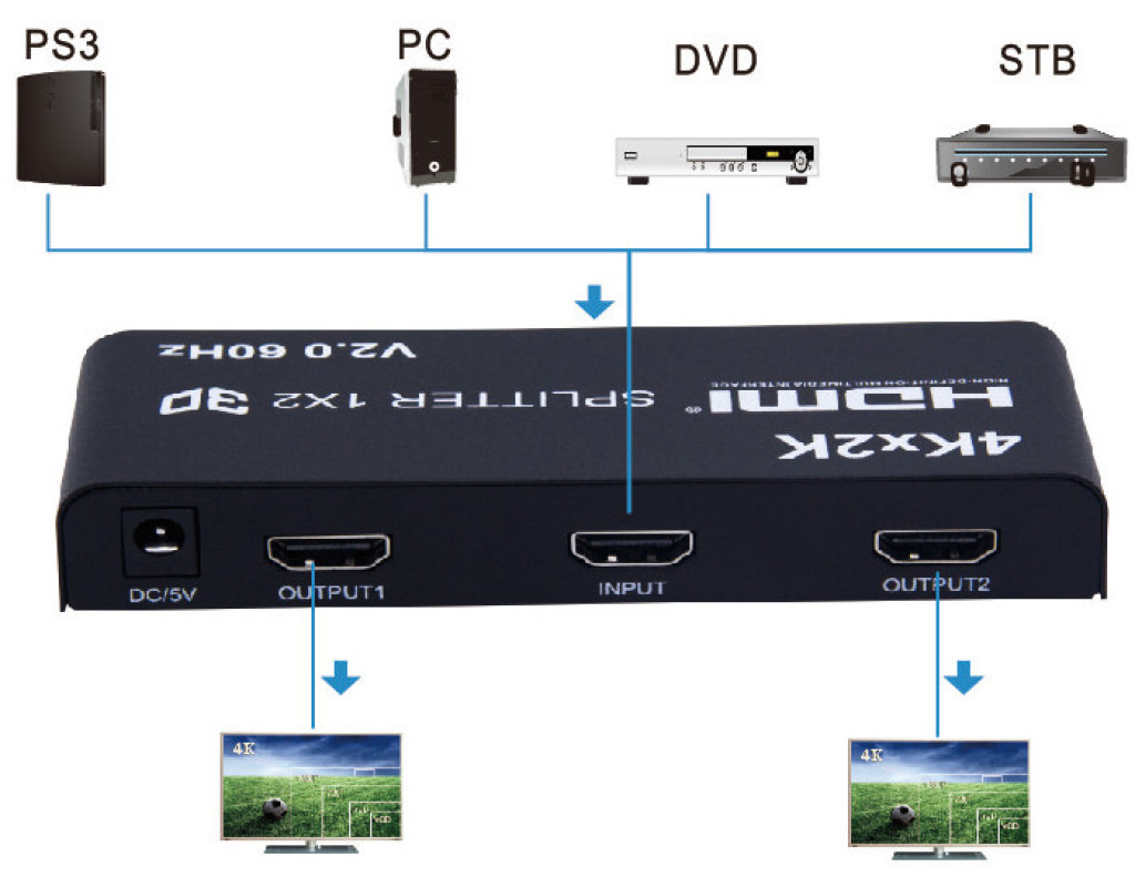 Сплітери HDMI 1x2 використовують одне джерело HDMI, забезпечуючи доступ до кількох приймачів HDMI. Це дозволяє легко розділити один пристрій HDMI на 2 або проектора, сумісні з HDMI. Крім того, його можна розмістити на кінці довгого кабелю HDMI для регенерації сигналу HDMI. Дозвіл цього розгалуджувача hdmi може становити до 3840x2160 / 60Гц. Особливості: Підтримка HDMI 2.0b Підтримка Full 3D Підтримка дозволу HDMI до 3840x2160 / 60Гц Підтримує максимальну швидкість передачі даних 6G і максимальну пропускну здатність 600Mhz Підтримка глибоких квітів 8/10/12 біт При використанні стандартного кабелю HDMI AWG26 підтримує вхід до 15 метрів, вихід до 20 метрів (дозвіл 1080p і 4K / 30 Гц) При використанні стандартного кабелю HDMI AWG26 підтримує вхід до 5 метрів, вихід до 5 метрів (4k / 60hz) Відображення одного джерела, мульти-виходу джерела сигналу високої чіткості від DVD-плеєра, аудіо / відео-ресивера, телеприставки Адаптер піт |