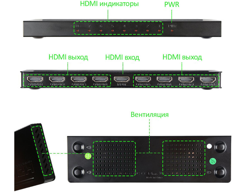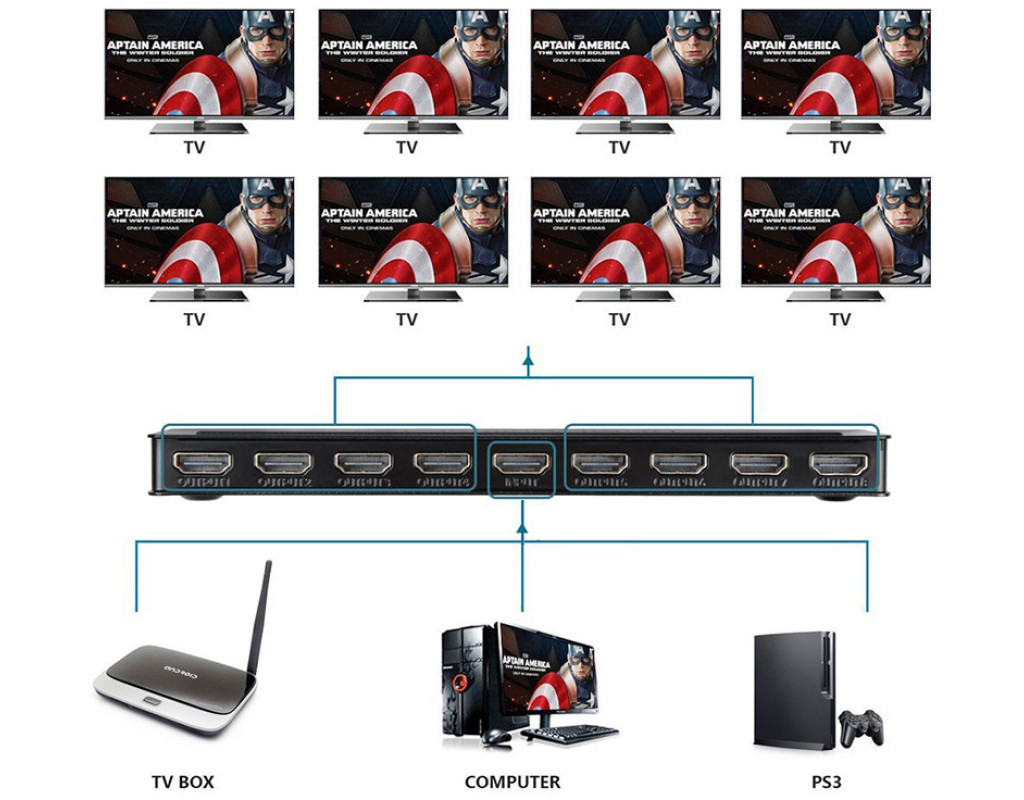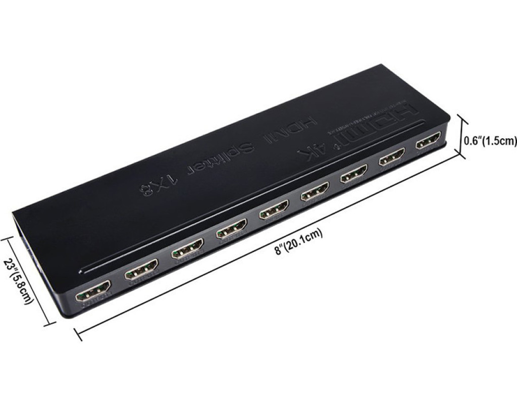 Розгалужувач HDMI 1x8 використовує одне джерело HDMI для доступу до декількох приймачів HDMI. Він дозволяє легко розділити один пристрій HDMI на вісім HDMI-сумісних моніторів або проекторів. Крім того, його також можна розмістити в кінці довгого HDMI кабель для регенерації сигналу HDMI. Дозвіл цього HDMI спліттера може становити до 3840X2160 / 30 Гц. Характеристики: