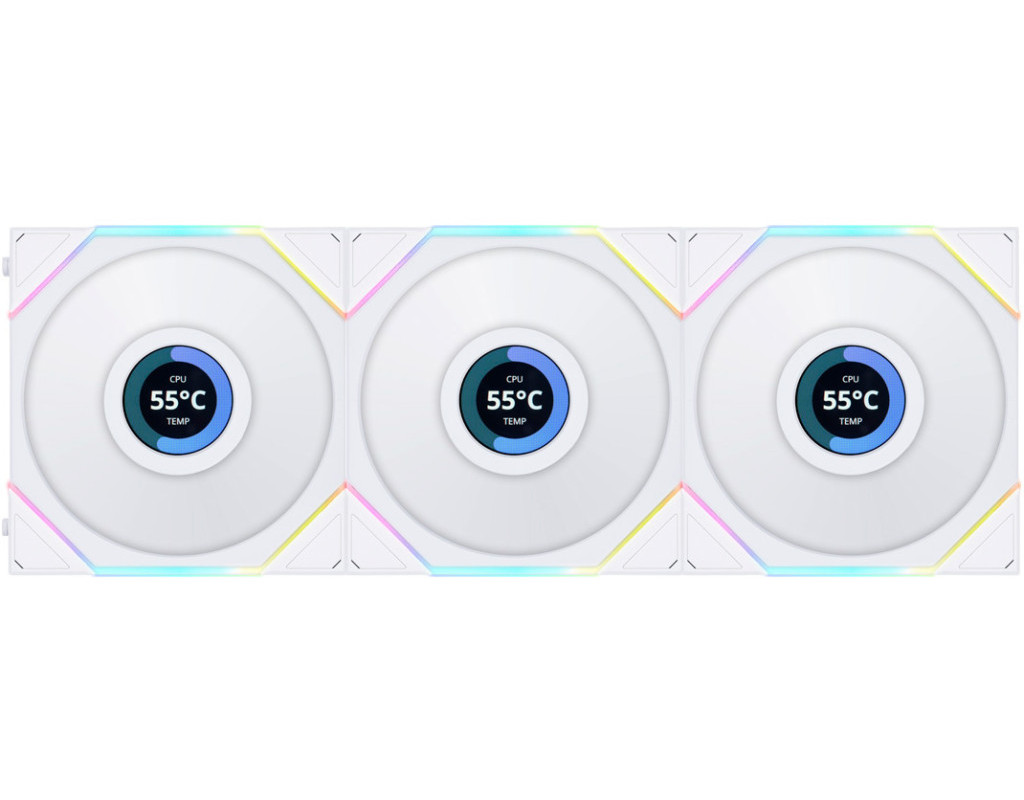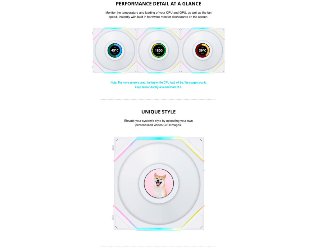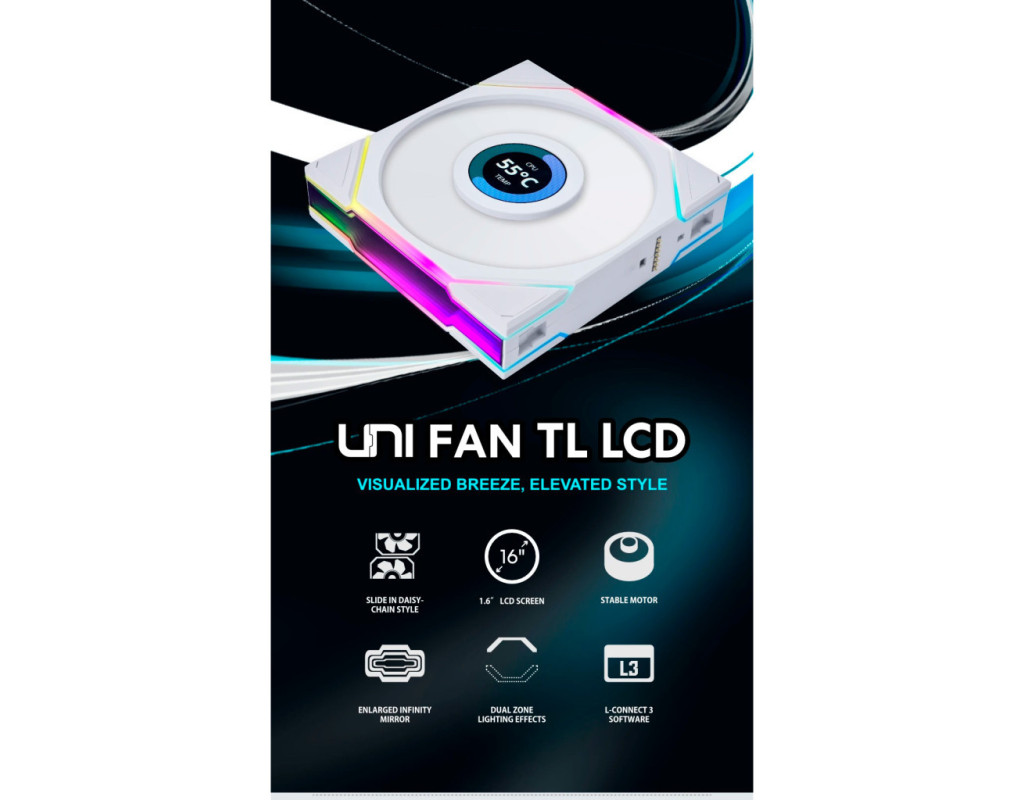 Відстежуйте температуру та завантаження CPU і GPU, а також швидкість обертання вентилятора за допомогою вбудованих панелей апаратного монітора на екрані. Унікальний стильПідніміть стиль вашої системи, завантаживши власний персоналізований MP4, GIF, JPG, PNG. Наступне покоління вентиляторів Uni FanСпираючись на успішний дизайн системи блокування серії Uni Fan, серія Uni Fan TL виводить безладну установку на новий рівень.