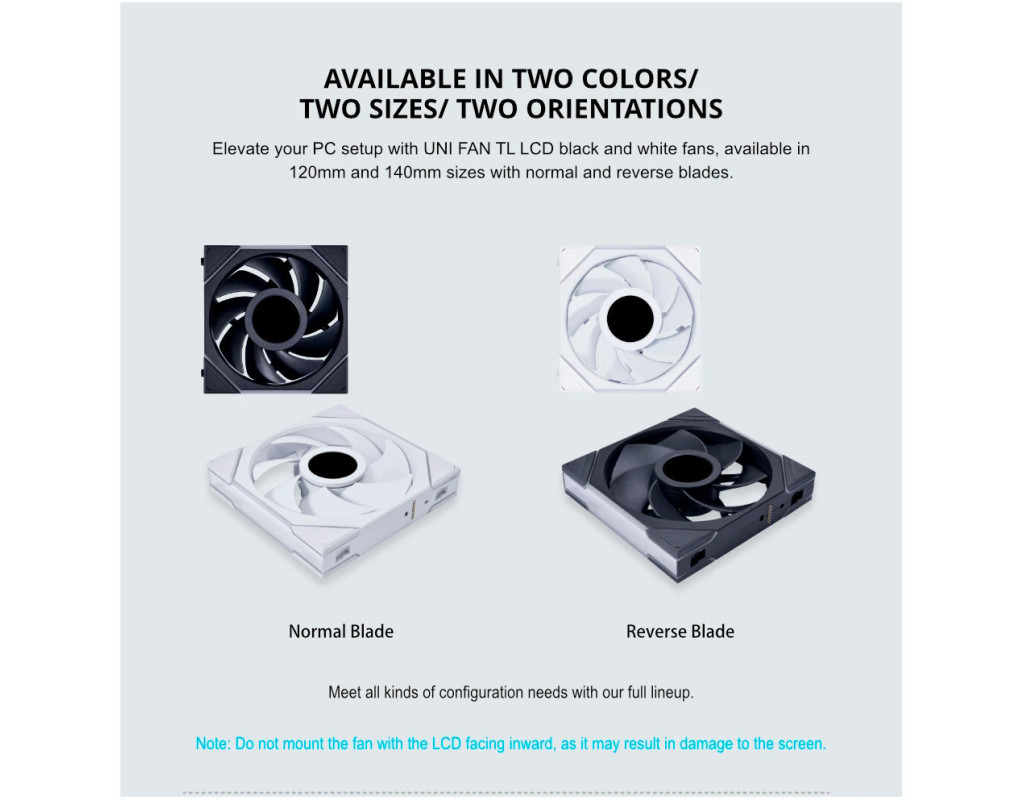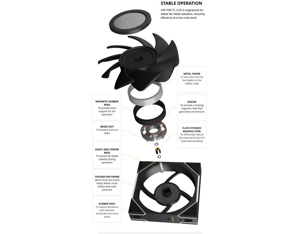 Вентилятори Uni Fan TL LCD розроблені для стабільної роботи лопатей вентилятора, забезпечуючи ефективність за низького рівня шуму.