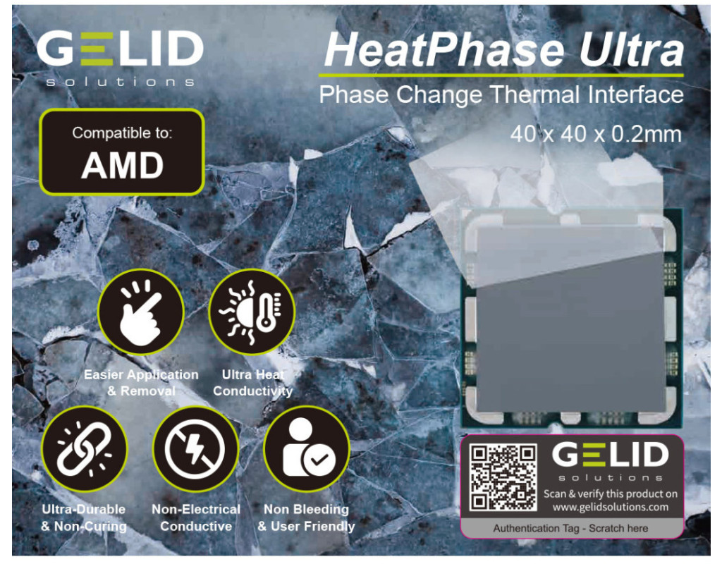 Gelid HeatPhase Ultra - термопасти з фазовим переходом, виготовленої у вигляді клейких пластинок. Ноу-хау компанії Gelid. HeatPhase Ultra - це значне поліпшення в управлінні температурним режимом з чудовою теплопровідністю, довговічністю і зручністю. Це практичне рішення підвищує продуктивність електронних пристроїв у важких умовах, що робить його незамінним для багатьох користувачів.