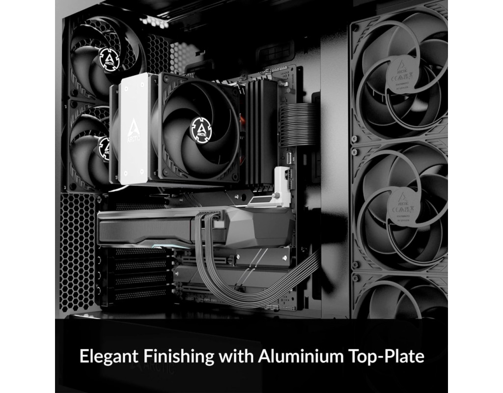 - Висококласне оздоблення з алюмінієвою верхньою пластиною: завдяки двотактній конфігурації Freezer 36 CO вражає не тільки ефективністю охолодження, а й своїм дизайном. Припаяні кінці теплових трубок приховані пригвинченою алюмінієвою кришкою, що дає змогу легко вписатися в будь-яку конфігурацію ПК і підкреслити як продуктивність, так і зовнішній вигляд.