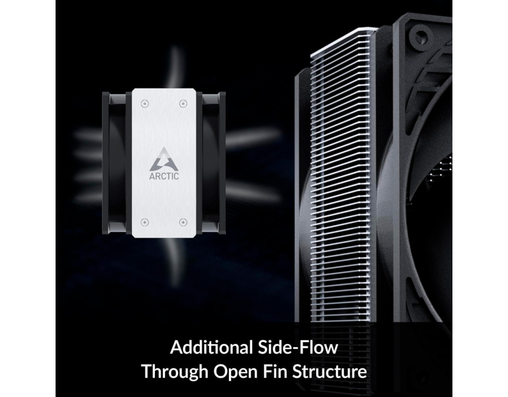 - Оптимізований радіатор: ребра радіатора відкриті збоку і дають змогу витяжному вентилятору витягати додаткове холодне повітря з корпусу ПК через радіатор. Така конструкція з бічним потоком забезпечує ще ефективнішу вентиляцію.