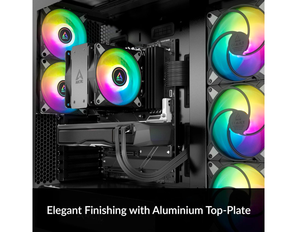 - Висококласне оздоблення із алюмінієвою верхньою пластиною: завдяки двотактній конфігурації Freezer 36 A-RGB вражає не лише ефективністю охолодження, але й своїм дизайном. Припаяні кінці теплових трубок приховані алюмінієвою кришкою, що дозволяє легко вписатися в будь-яку конфігурацію ПК і підкреслити як продуктивність, так і зовнішній вигляд.
