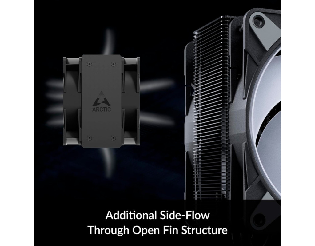 - Оптимізований радіатор: ребра радіатора відкриті збоку та дозволяють витяжному вентилятору витягувати додаткове холодне повітря із корпусу ПК через радіатор. Така конструкція з бічним потоком забезпечує ще ефективнішу вентиляцію.