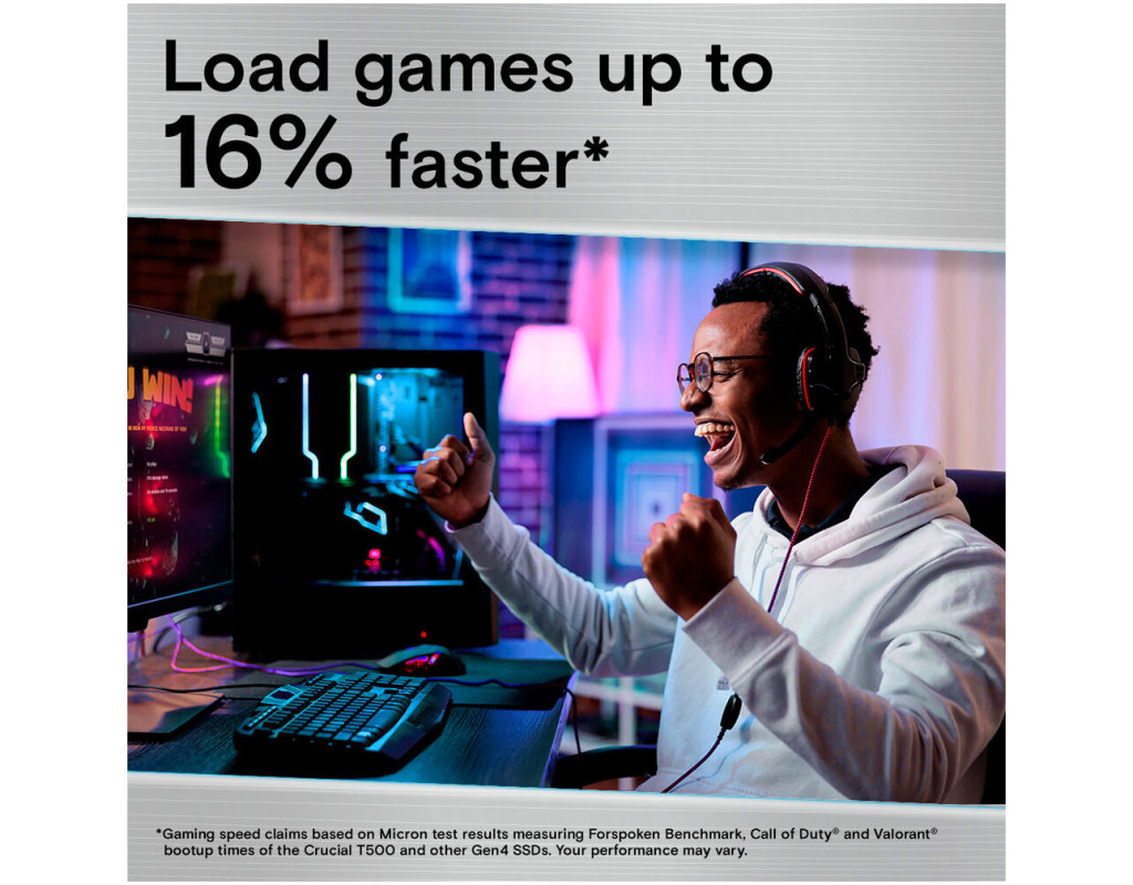 Прискорення завантаження, завантаження та збереження за допомогою послідовного читання/запису 7400/7000 МБ/с — Crucial T500 PCle 4.0 NVMe SSD більш ніж у 2 рази швидший, ніж Gen3 SSD, і в 12 разів швидше ніж SATA.