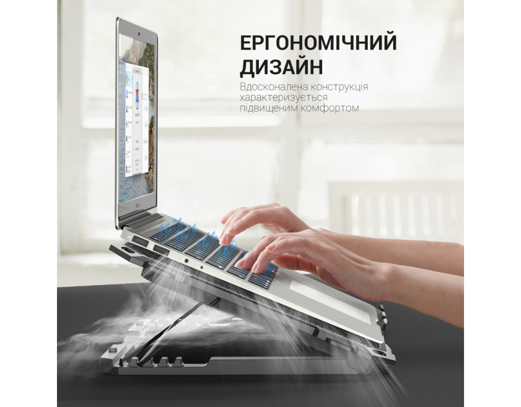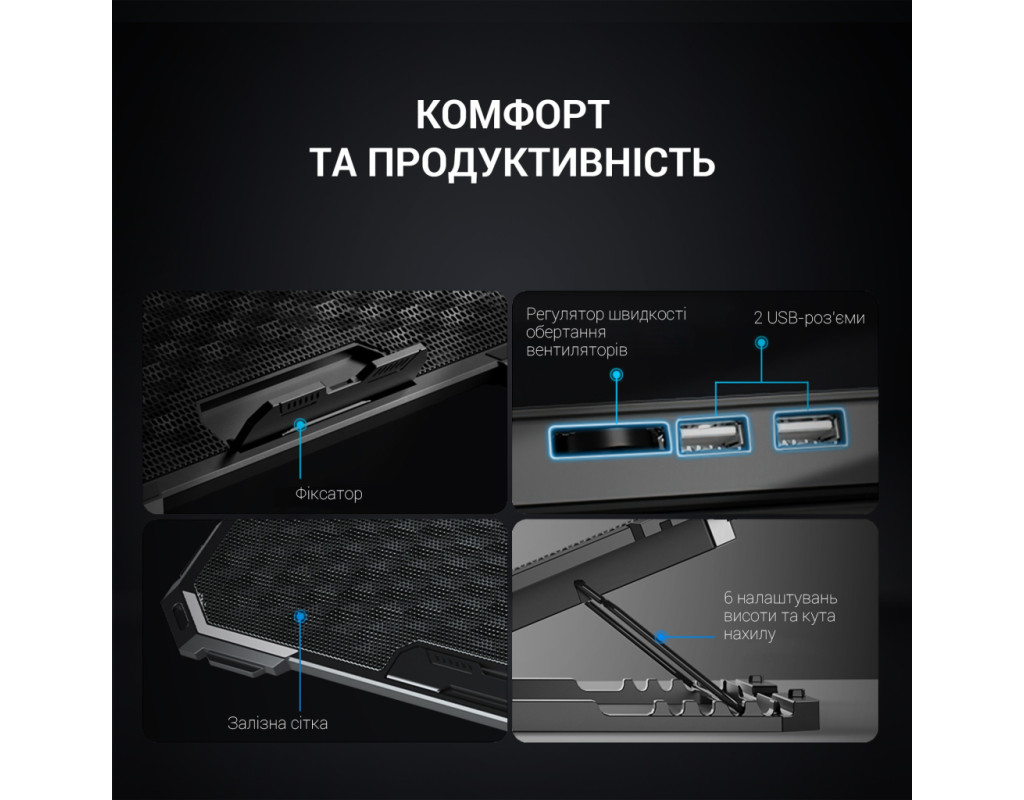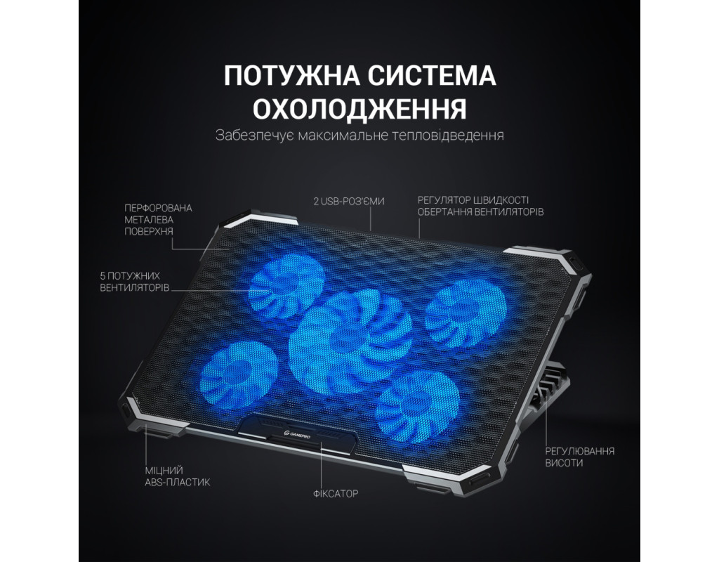GamePro CP485 оснащена великим вентилятором розміром 120х120х20 мм, що працює на швидкості 1000 обертів на хвилину. Крім великого вентилятора, є чотири маленькі вентилятори розміром 70х70х15 мм, які можуть працювати на швидкості 2400 обертів за хвилину. Завдяки регулятору швидкості обертання вентиляторів можна самостійно вибрати оптимальний рівень охолодження відповідно до своїх потреб. Ця підставка також має два роз'єми USB, що робить її не лише зручною для використання, а й додатковою станцією для підключення інших пристроїв. А ще вона вражає своєю гнучкістю - 6 налаштувань висоти дають змогу знайти зручне положення для роботи. GamePro CP485 виготовлена з високоякісних матеріалів, таких як АБС-пластик і металева сітка. Їхнє поєднання надає підставці стійкості та довговічності, а також приємного зовнішнього вигляду. Завдяки цій підставці ваш ноутбук тепер не тільки працюватиме швидше і стабільніше, а й матиме елегантний вигляд на робочому столі. Це справжнє вдосконалення вашої робочої зони, призначене для тих, хто цінує комфорт і продуктивність. |