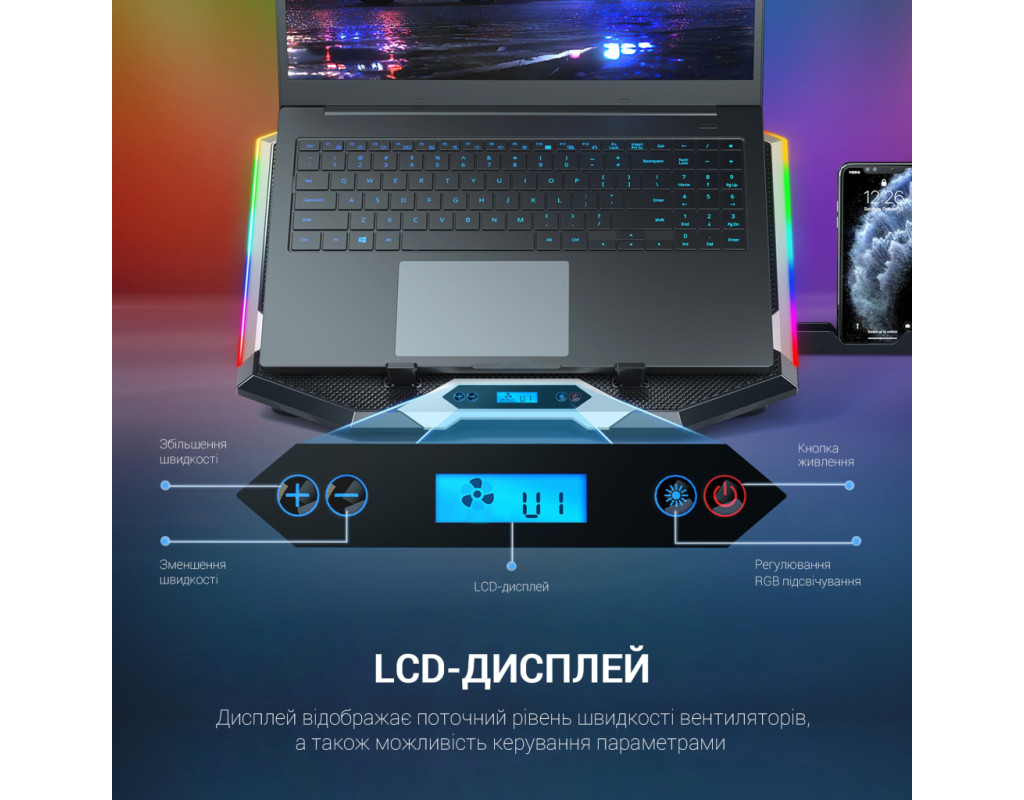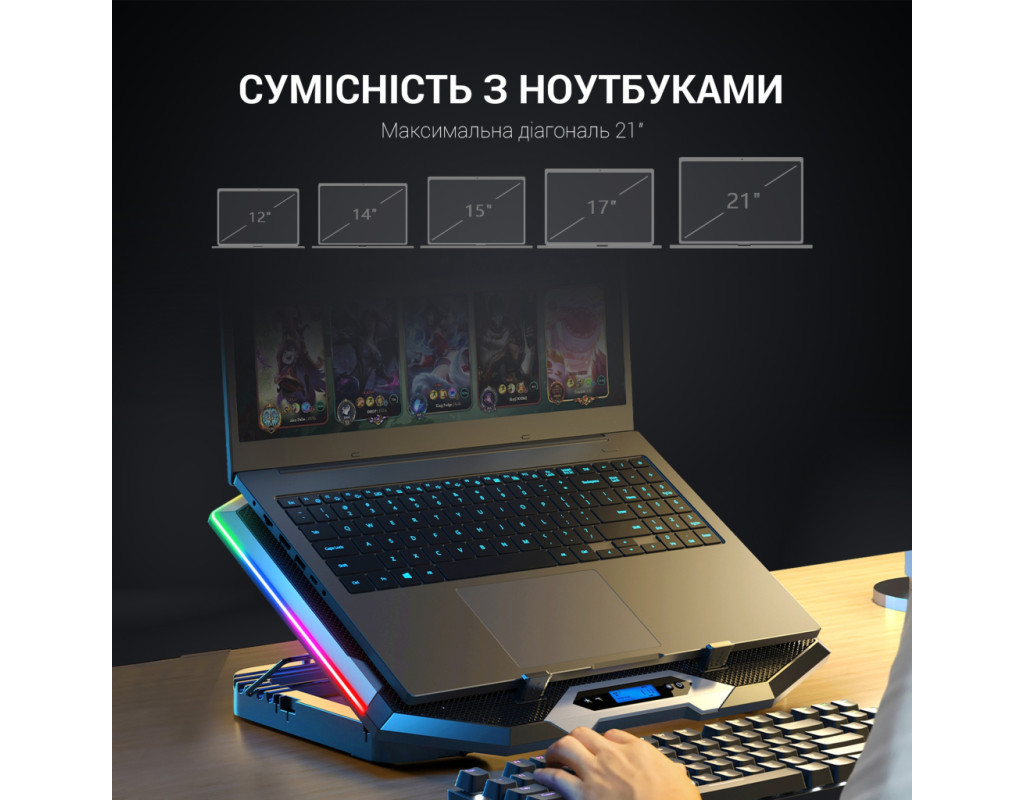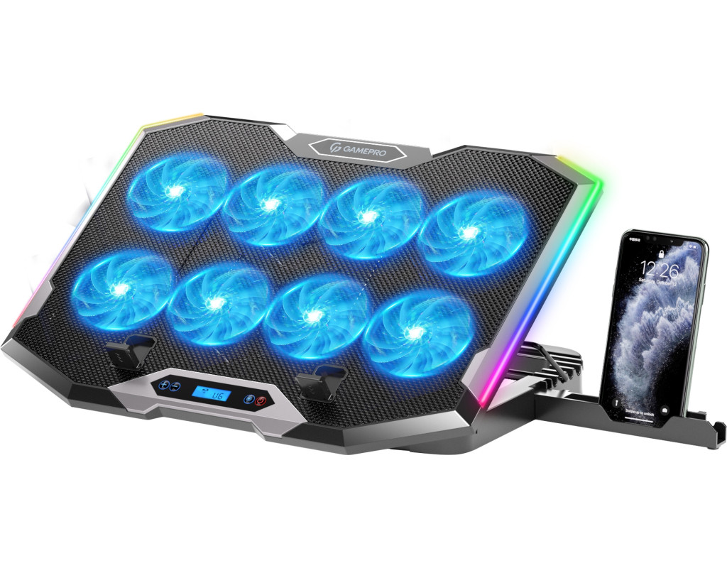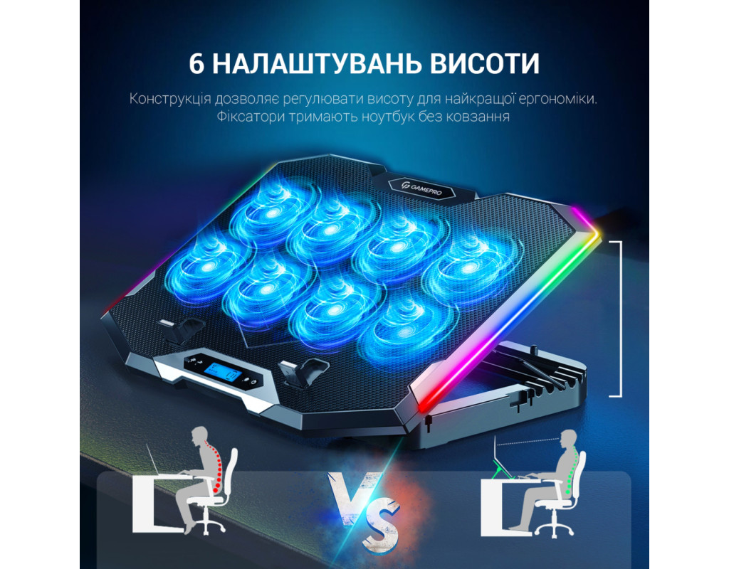 GamePro CP870 обладнана вісьмома потужними вентиляторами розміром 70х70х15 мм, що працюють на вражаючій швидкості обертання - 2400 об/хв. Завдяки шести налаштованим рівням висоти, кожен користувач може знайти оптимальний кут для роботи або розваг. І це не все - десять різних режимів RGB-підсвічування створюють неповторну атмосферу, роблячи робочий або ігровий процес ще більш захопливим. Робоча напруга всього 5V, а отже, ця підставка енергоефективна й економічна. Два роз'єми USB для під'єднання додаткових пристроїв, а також тримач для смартфона, щоб ви могли тримати свій гаджет прямо перед собою. CP870 також оснащений LCD-дисплеєм, який відображає вам інформацію про поточний рівень швидкості вентиляторів, а також можливість управління параметрами через легкий і зручний інтерфейс. Матеріали, використані для створення цієї підставки, варті вашої уваги: залізна сітка і високоякісний пластиковий АБС гарантують довгий термін служби і надійність. Завдяки цим характеристикам, CP870 - це не просто гаджет, а ваш надійний помічник у створенні комфортного та продуктивного робочого середовища. |