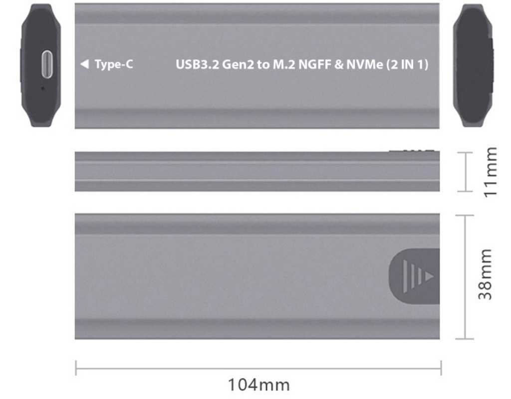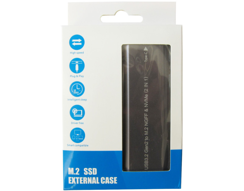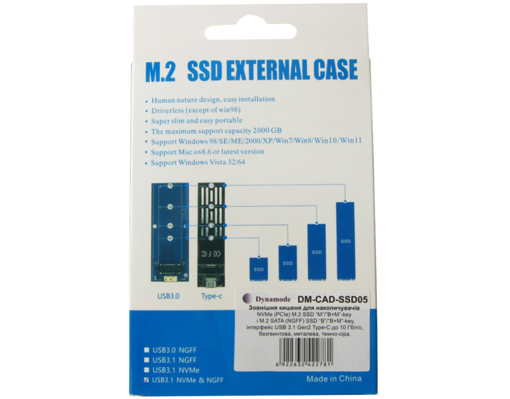 Зовнішня кишеня Dynamode DM-CAD-SSD05 з безгвинтовим кріпленням призначена для твердотільних накопичувачів обох типів - M.2 SSD NVMe (PCIe) і M.2 SSD SATA (NGFF) - таким чином ця кишеня підтримує всі доступні зараз на ринку види SSD M. 2. Він дозволяє використовувати SSD-накопичувач як зовнішній жорсткий диск USB на будь-якому ноутбуці, комп'ютері, мобільному телефоні або планшеті.