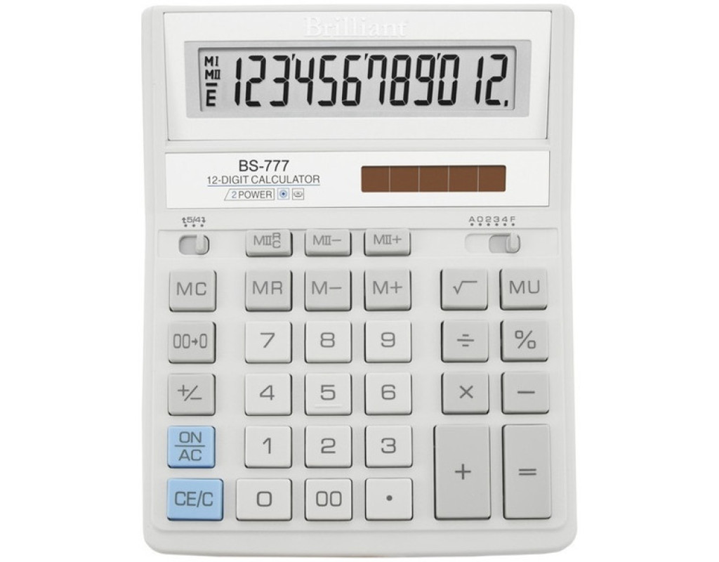 Професійний калькулятор Brilliant BS-777WH допоможе легко зробити різні підрахунки, обчислити відсотки, підрахувати підсумкову суму. Володіє такими властивостями як: автоматичне вимикання живлення, захист від залипання клавіш. Присутня клавіша знака числа, клавіша операції "підвищення ціни", клавіша видалення останньої цифри, клавіша загальної суми операції, перемикач "режим округлення", перемикач "кількість знаків після коми", клавіша загальної суми операції, клавіші установки ціни з податком. Особливості: дворівнева пам'ять. Клавіша видалення останньої цифри. Клавіша знака числа. Захист від залипання клавіш. Літієва + сонячна батарея живлення. Клавіша "00". 12-розрядний. Пластмасові клавіші. |