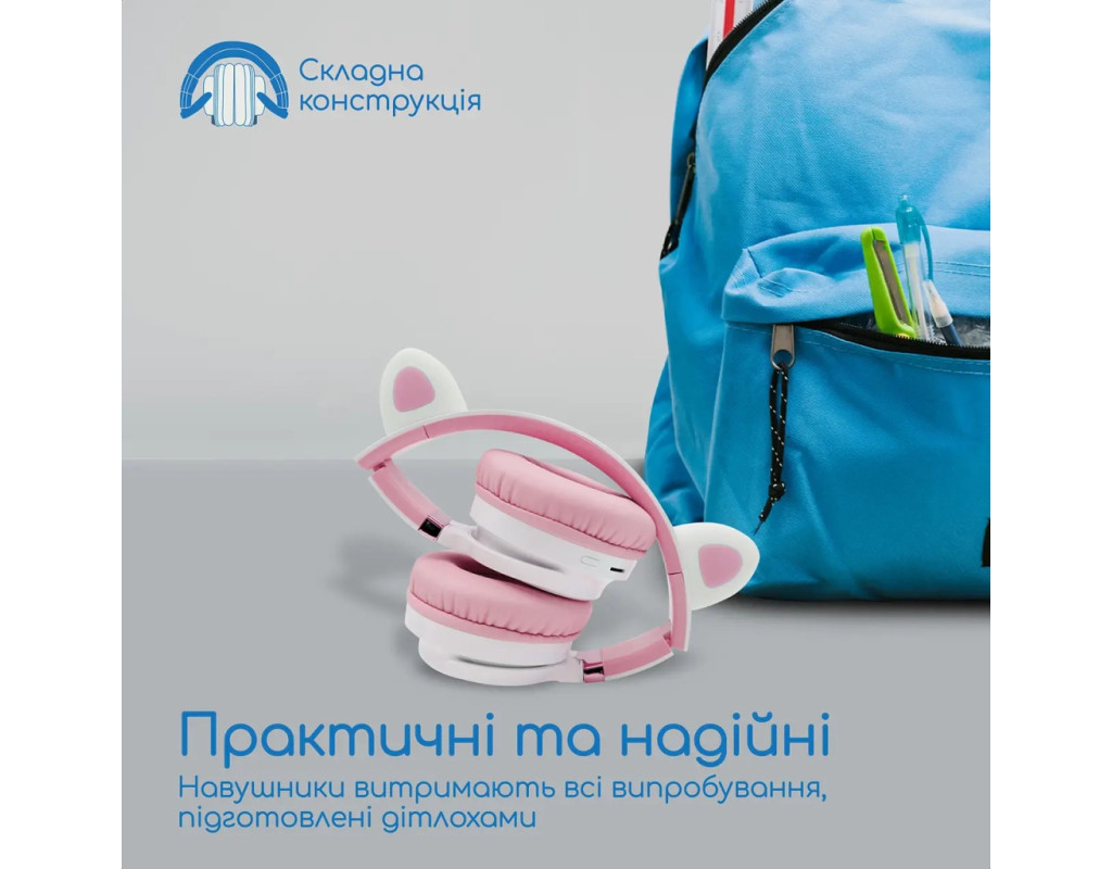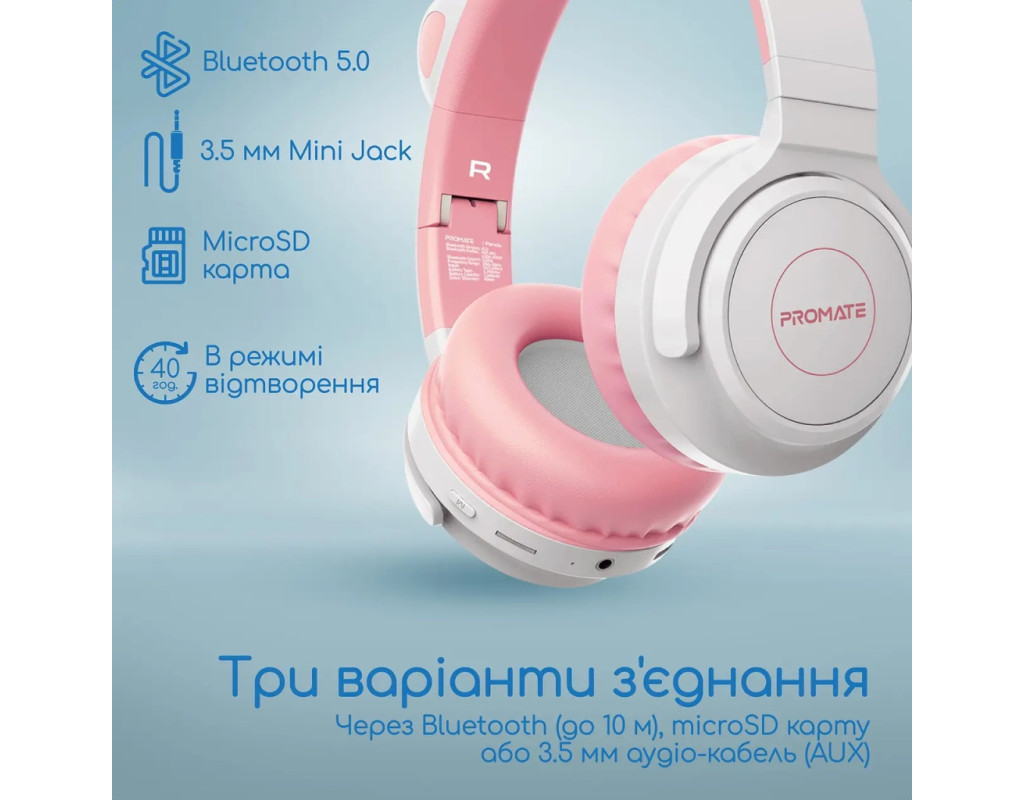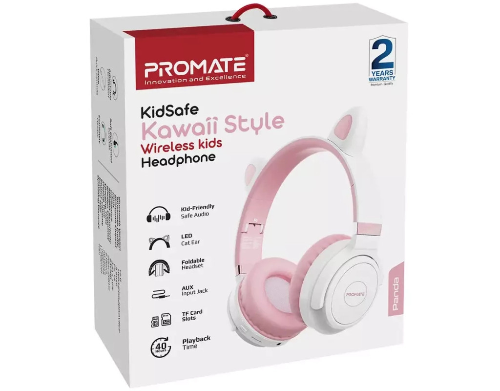 | Навушники Promate Panda Bubblegum (panda.bubblegum) – це досконале поєднання стилю, якості та інновацій для ваших дітей. Гармонійно інтегруючи аудіальні рішення в повсякденне життя малюків, ці дитячі накладні навушники забезпечують незабутній досвід під час прослуховування музики, перегляду мультфільмів чи навіть навчальних занять. Підключення через Bluetooth 5.0 забезпечує стабільний зв'язок, що дозволяє вашій дитині рухатися свобідно без будь-яких обмежень. Крім того, традиційне з'єднання через Jack 3.5 мм гарантує універсальність пристрою – довжина кабелю 1.5 метра буде зручною для всіх випадків. Це робить навушники ідеальними для використання з будь-яким гаджетом: чи то телефон, ноутбук або телевізор. Оцініть філігранну якість звуку, яку забезпечує акустичне оформлення з підтримкою звуку 2.0. Звук приємний та чистий, а сертифікований обмежувач гучності гарантує безпеку слуху, обмежуючи максимальний рівень гучності до 93 дБ. Це робить ці навушники надійним вибором для молодших користувачів. Комфортні у використанні, вони мають зручну конструкцію з наголов'ям, яка легко регулюється під розмір голови дитини, забезпечуючи стабільну посадку без тиску. М’які амбушури з шкірозамінника створюють комфортне оточення, навіть якщо навушники носити тривало. Навушники легкі, вага складає лише 240 грамів, тож вони абсолютно не заважатимуть. Унікальний дизайн навушників Promate Panda Bubblegum приваблює з першого погляду. Яскравий зовнішній вигляд знайшов своє доповнення в котячих вушках з LED підсвіткою, що роблять цей аксесуар справді особливим. Світлодіодне підсвічування створює ефектний вигляд, підкреслюючи веселий та юний стиль. Вбудований мікрофон дозволяє надійно передавати голос, що робить ці навушники оптимальним вибором для онлайн-комунікації та навчання. Якість збірки та міцність конструкції обіцяють довговічність навіть при активному використанні. Li-Pol акумулятор потужністю 1000 мАг залишає позаду конкурентів, дозволяючи навушникам працювати до 40 годин без підзарядки. Це означає, що ваша дитина зможе насолоджуватися улюбленими мелодіями та мультфільмами без перерви на підзарядку. Promate Panda Bubblegum – не лише навушники, а справжній товариш для вашої дитини. Вони перетворюють кожен день на яскраве свято звуку та стилю, відкриваючи нові горизонти для веселощів та навчання. Оберіть найкраще для вашої дитини – оберіть Promate Panda Bubblegum, щоб кожен момент став неповторним! |