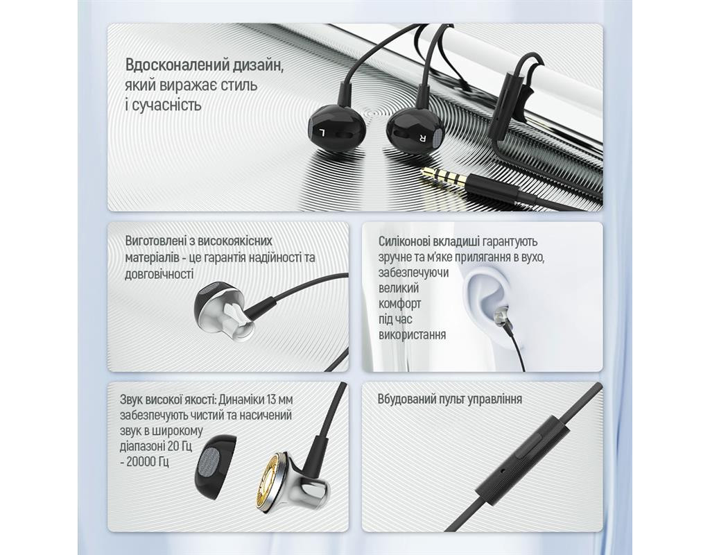 Мікрофон Вбудований мікрофон забезпечує чіткий прийом звуку, високу стабільність та усунення небажаних шумів під час розмови Комфорт Легка конструкція та покращена ергономічна форма навушників забезпечують максимальний комфорт під час використання, щільне прилягання до вух, підходять як для повсякденного використання, так і для активних видів діяльності. Широка сумісність Навушники сумісні з пристроями, обладнаними аудіороз'ємом 3.5 мм, включаючи смартфони, планшети та комп'ютери Надійний кабель Міцне обплетення кабелю надає йому стійкості та запобігає його заплутуванню, забезпечуючи надійність використання. Вбудований пульт керування Пульт дистанційного керування на кабелі дозволяє керувати музикою без необхідності виймати телефон, регулювати гучність та керувати відтворенням Зручні силіконові вкладиші Силіконові вкладиші забезпечують оптимальне та м'яке прилягання до вуха, збільшуючи комфорт під час використання Передова композитна котушка діафрагми Використана технологія мінімізує перешкоди та забезпечує стабільний потік повітря, підтримуючи високу якість звучання Вихідна потужність 3mW/Max: 5mW Навушники-гарнітура ColorWay призначені для прослуховування аудіо та використання під час голосового спілкування через мобільні пристрої, такі як смартфони, планшети або комп'ютери. Їхні 13-міліметрові динаміки високої роздільної здатності забезпечують чистий і насичений звук найвищої якості, відтворюючи навіть найскладніші музичні композиції з використанням ультратонкої мембрани для багатошарової деталізації та емоційного звучання в діапазоні від 20 Гц до 20000 Гц. Ці дротяні навушники оснащені роз'ємом jack 3.5 мм, а довжина кабелю становить 0.6 метра. На самому кабелі навушників розташована панель управління з трьома кнопками, а також високоякісний мікрофон, що забезпечує передачу вашого голосу з максимальною чіткістю під час розмови та придушення небажаних шумів. Крім відмінної якості звуку та легкості використання, навушники виділяються високоякісними матеріалами та ретельно продуманими розмірами. Їхня анатомічна форма забезпечує невидимість і комфорт для вух, навіть при тривалому використанні. |