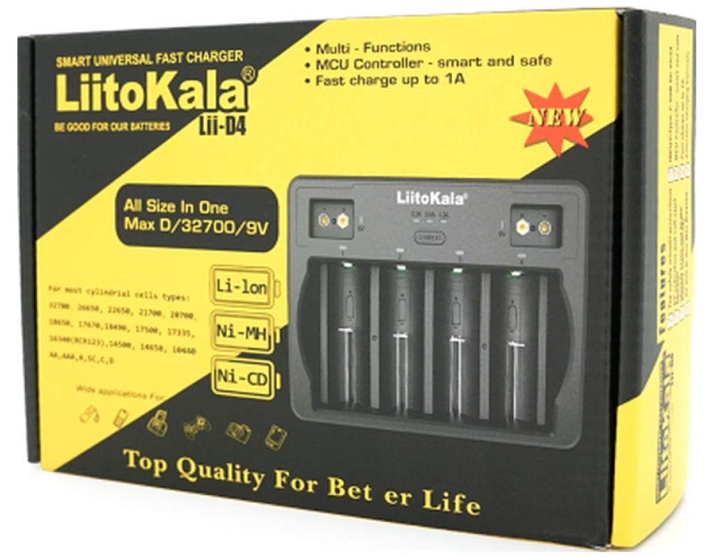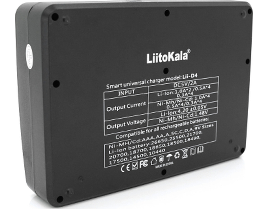 ЗУ універсальне Liitokala Lii-D4 є зарядним пристроєм з можливістю заряду різних типів акумуляторів, включаючи Ni-MH, Ni-Cd і Li-ion/IMR. |