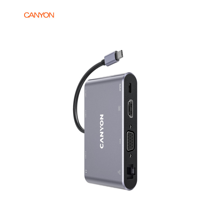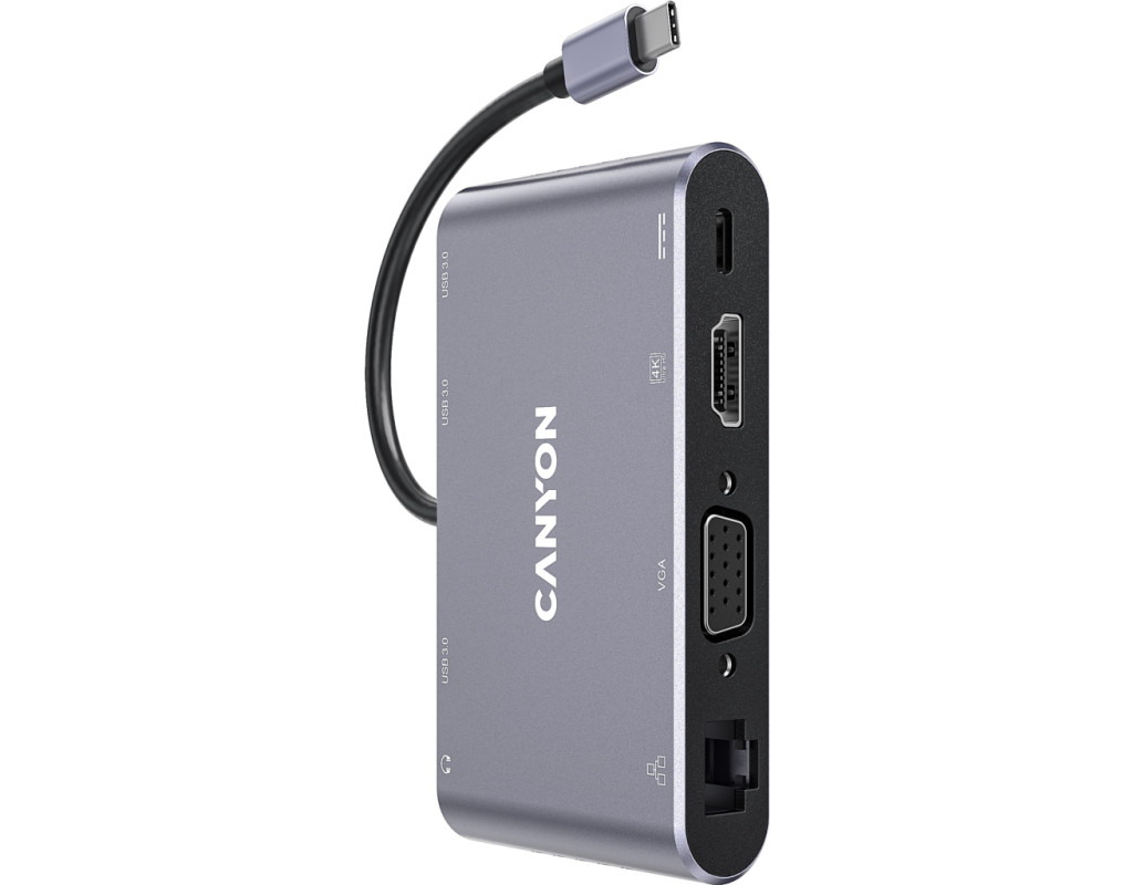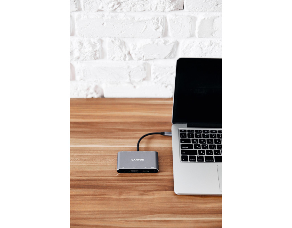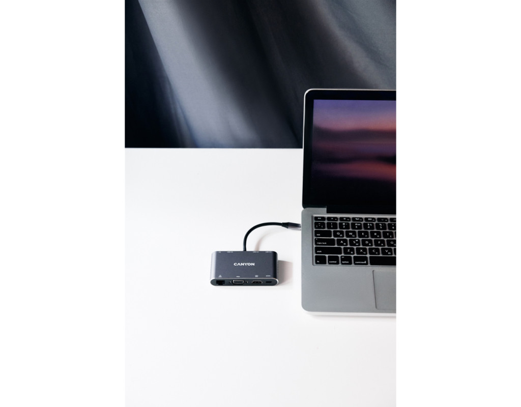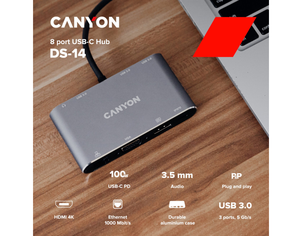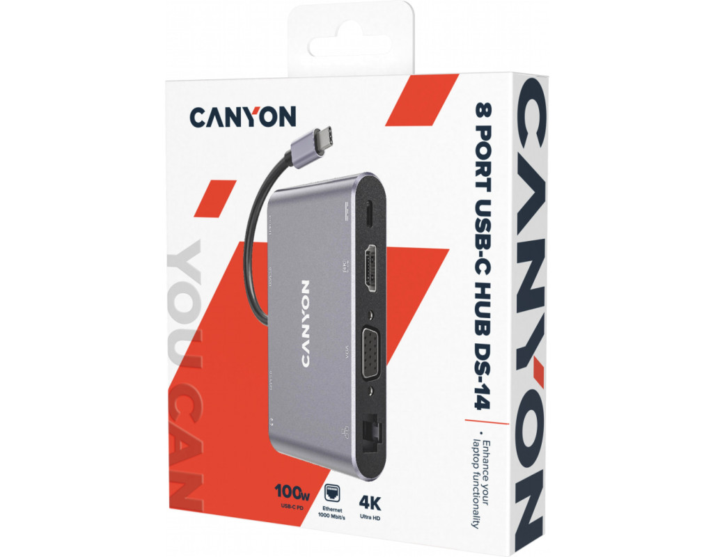 Хаб DS-14 з'єднує один USB-C порт із вісьмома різноплановими роз'ємами. Монітор можна підключити через порт HDMI або VGA. Передбачено міні-джек для навушників чи колонок. Три порти USB-A 3.0 дозволять із зручністю підключити відразу три периферійні аксесуари. Роз'єм для заряджання USB-C PD потужністю до 100 Вт дозволяє заряджати підключений пристрій з оптимальною швидкістю. За допомогою хаба можна підключитись до мережі через Gigabit Ethernet. Легкий та міцний корпус із алюмінію допомагає зберегти якість передачі сигналу. “Plug and Play“ – підключи хаб та працюй без встановлення додаткового ПЗ. Завдяки компактному розміру хаб займе мінімум місця у сумці. Відмінне поєднання габаритів та функціональності! |