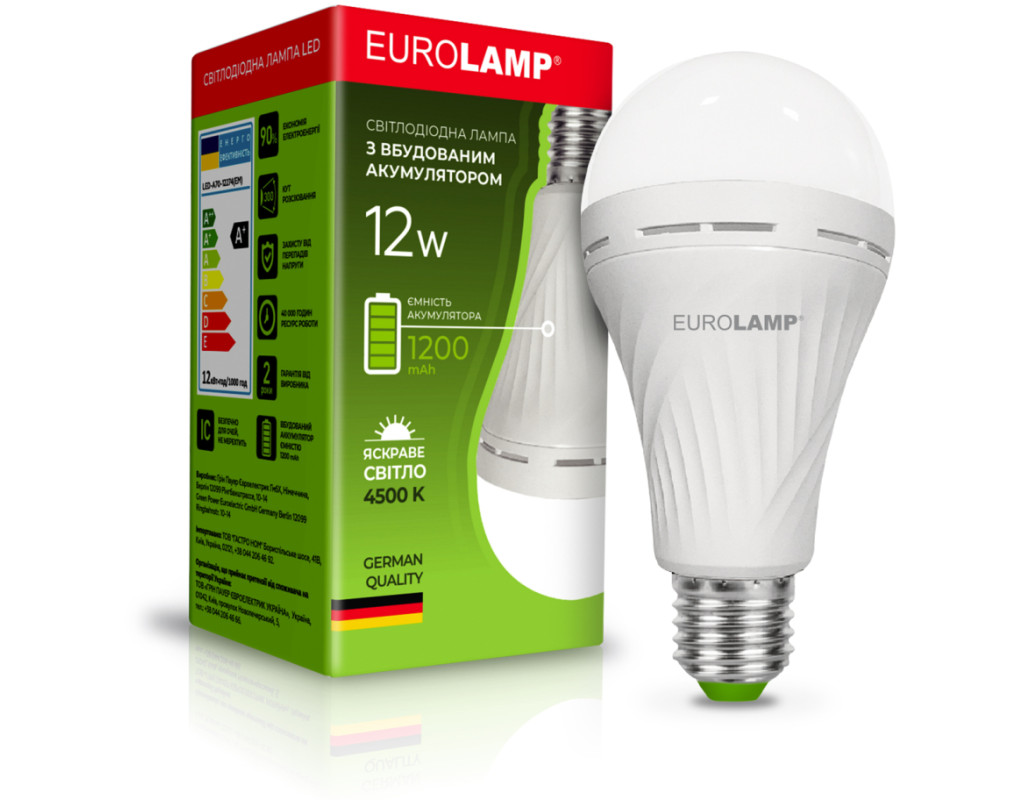 | Світлодіодна лампа EUROLAMP LED Лампа з акумулятором А70 12W E27 4500K є універсальним освітлювальним приладом. Призначена як для основного освітлення, так і для організації автономного освітлення в житлових і побутових приміщеннях в період віялового/аварійного відключення електрики. Також може використовуватися як автономне джерело світла у підсобних приміщеннях, фермерських господарствах, кемпінгах, дачних спорудах. Для зручності експлуатації в даних умовах, у комплекті з лампою додається цоколь з кнопкою та гачком, що дозволить легко розмістити лампу у необхідному місці. Крім цього, цей світильник можна використовувати як звичайний ручний ліхтарик. Вкрутивши лампу в патрон, вона може служити для індивідуального використання у темний час доби або в приміщеннях без освітлення. Особливості роботи та переваги: - ресурс автономної роботи до 3-х годин