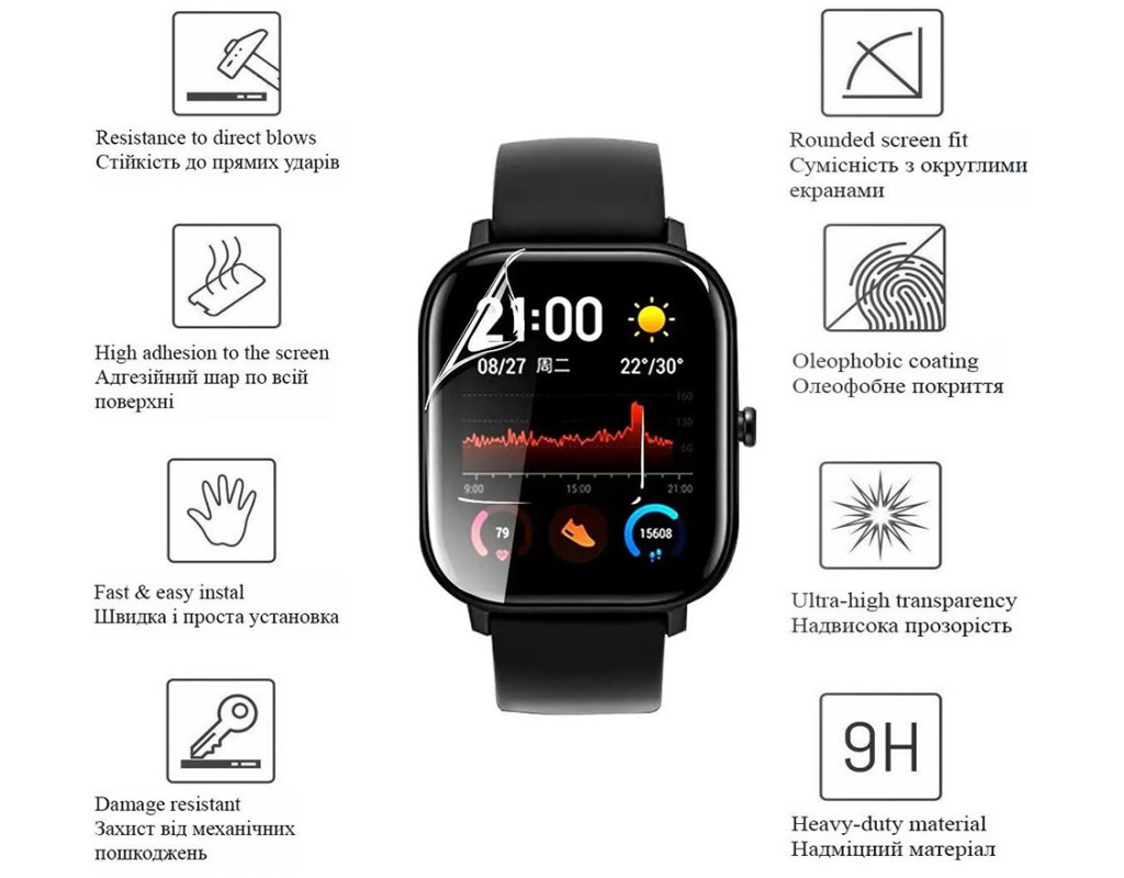 Призначення - для смарт годинника, Вид покриття - захисний, гідрогелева, Сумісність з моделями - Amazfit Bip 3, Кількість в упаковці - 2 шт