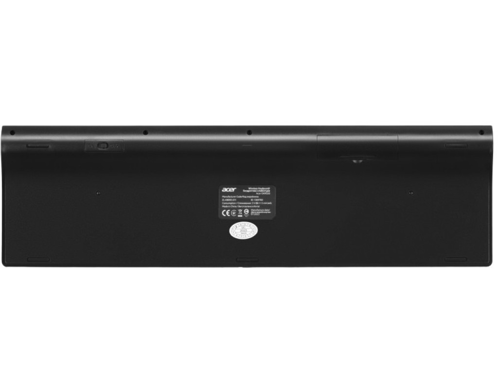 | Клавіатура ACER OKR020 має класичний дизайн, чорний колір добре підходить для офісу та для дому. Клавіатура має конструктивне рішення зі стандартним розташуванням усіх клавіш, що сприяє їхньому швидкому запам'ятовуванню та зручній роботі. Відстань між клавішами невелика, що дає змогу плавно набирати текст, не боячись натиснути 2 клавіші відразу. Кнопки невисокі та мають хороший хід. Клавіатура має бездротове підключення і зв'язується з комп'ютером через радіоканал. Невеликий приймач підключається через інтерфейс USB. Клавіатура ACER OKR020 обладнана 4 спеціальними мультимедійними клавішами. |