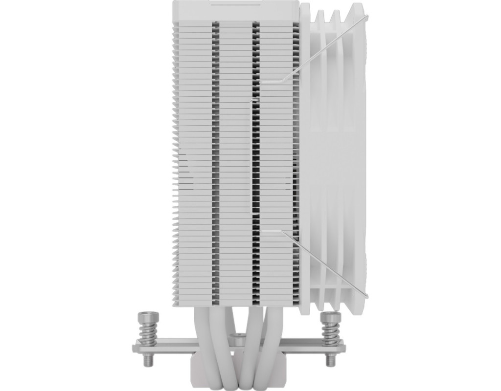 Серія Boreas E2-410, доступна в матовому чорному та сніжно-білому кольорах, оснащена 4 сучасними мідними тепловими трубками з технологією прямого контакту, товстою мідною пластиною основи, одним 120-мм високопродуктивним вентилятором з гідравлічним підшипником PWM та гладкою ромбоподібною сітчастою кришкою з градієнтом, що поєднує найвищу продуктивність охолодження з елегантною естетикою. Елегантний та потужний Boreas E2-410 WH оснащений модернізованими тепловими трубками та ребрами, що забезпечують потужне та ефективне охолодження, зберігаючи при цьому першокласний зовнішній вигляд. Повністю біле покриття та ромбоподібна градієнтна верхня кришка роблять його ідеальним рішенням для сучасних систем класу "мейнстрім". Преміальне рішення для охолодження Кулер оснащений чотирма сучасними мідними тепловими трубками з технологією прямого контакту, товстою опорною пластиною для підвищення продуктивності та збільшеною площею поверхні для більш ефективного теплообміну. Безшумний та потужний Пристрій оснащений 120-мм високоякісним вентилятором, здатним забезпечити повітряний потік до 72.94 CFM та статичний тиск 2.63 мм H2O. Завдяки гідравлічному підшипнику преміум-класу та функції PWM вентилятор забезпечує до 1800 об/хв у безшумному режимі роботи. Повний кліренс Цей процесорний кулер забезпечує безперешкодний доступ до слотів DIMM, що дозволяє користувачам легко модернізувати материнські плати як Intel, так і AMD. Універсальна сумісність Серія Boreas E2-410 поставляється з універсальним монтажним комплектом Gamdias для легкої установки на новітні платформи Intel та AMD. (LGA 1700/AM5) |