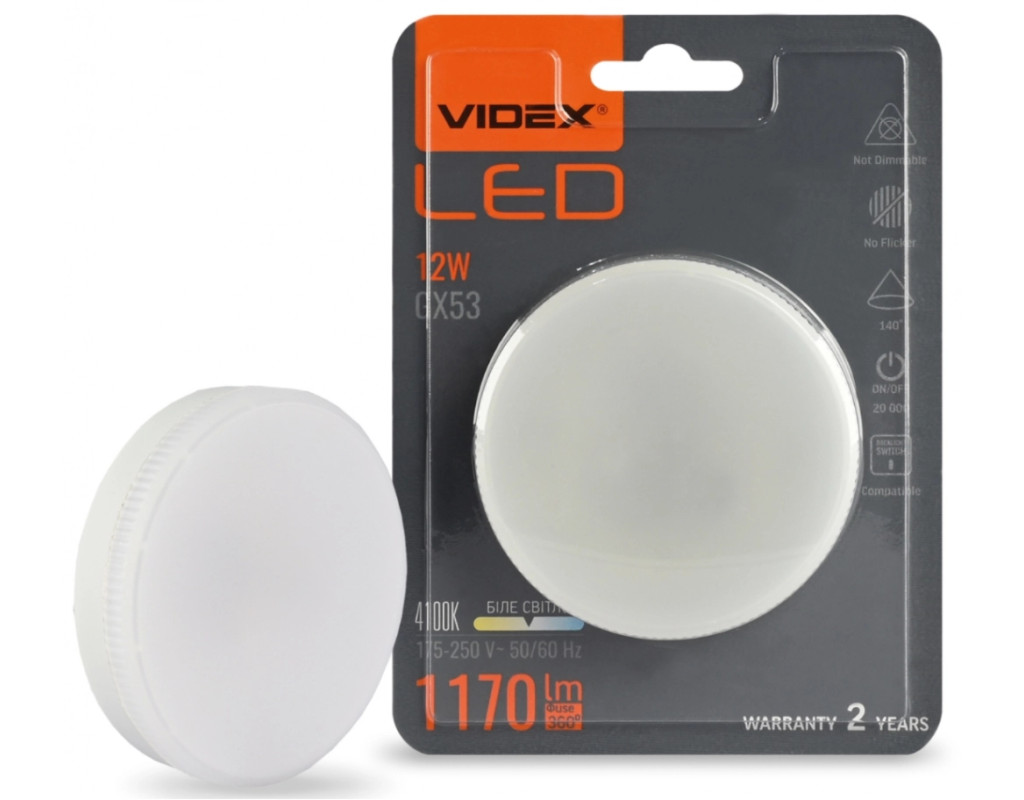| LED лампа VIDEX GX53 12W 4100K 220V - це сучасне інноваційне рішення для освітлення вашого простору. Використовується в сучасних світильниках як для загального освітлення так і декоративного, інтер'єрного та акцентного. Це все залежить від дизайнерських та особистих смакових якостей споживача. З її потужністю 12W і яскравістю 1170 Lm, вона забезпечує якісне та яскраве світло, при цьому споживаючи мінімум енергії. Особливості: