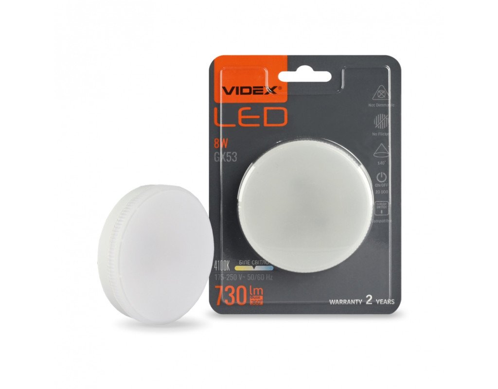 | LED лампа VIDEX GX53 8W 4100K 220V - це сучасне інноваційне рішення для освітлення вашого простору. Використовується в сучасних світильниках як для загального освітлення так і декоративного, інтер'єрного та акцентного. Це все залежить від дизайнерських та особистих смакових якостей споживача. З її потужністю 8W і яскравістю 730 Lm, вона забезпечує якісне та яскраве світло, при цьому споживаючи мінімум енергії. Особливості: