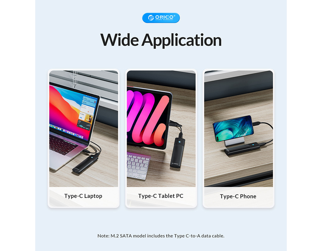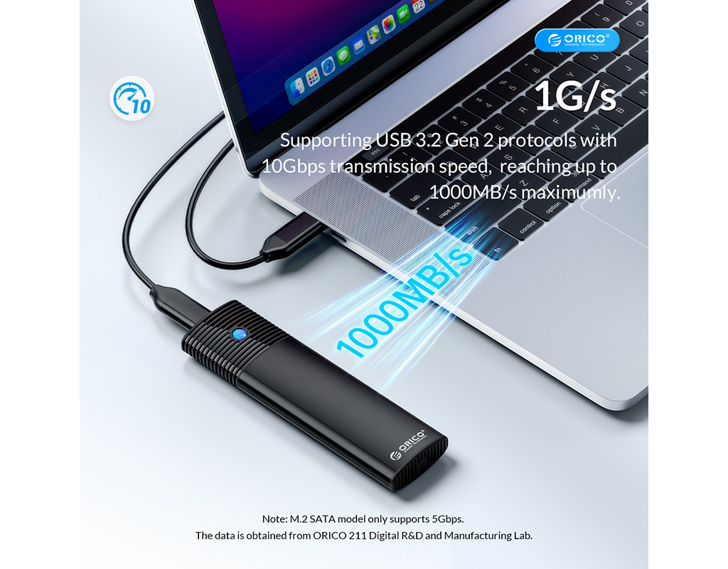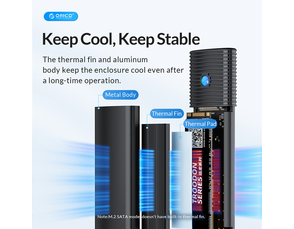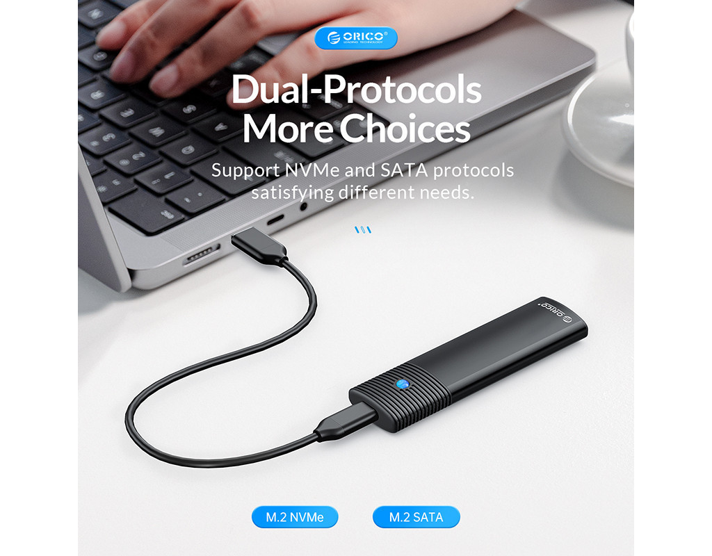 Корпус Orico SSD Enclosure з подвійним протоколом надає можливість використовувати диски M.2 NVMe і NGFF (SATA), забезпечуючи широку сумісність.
