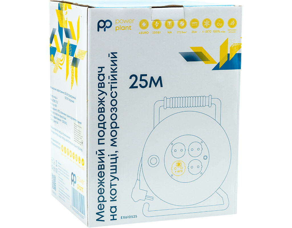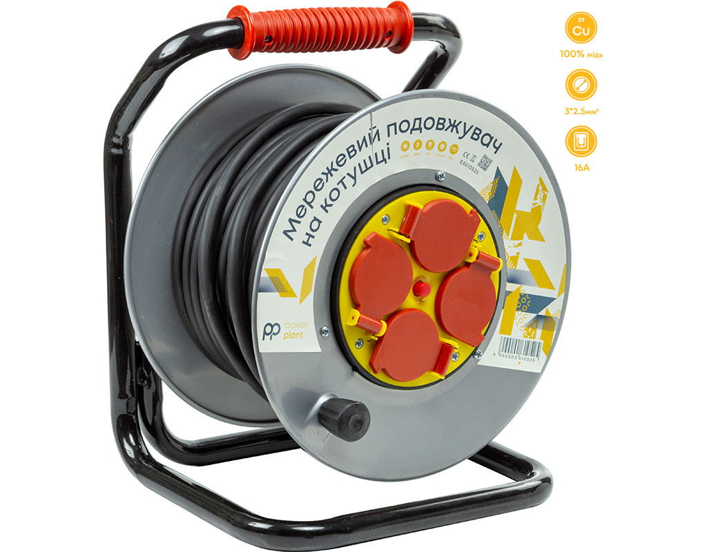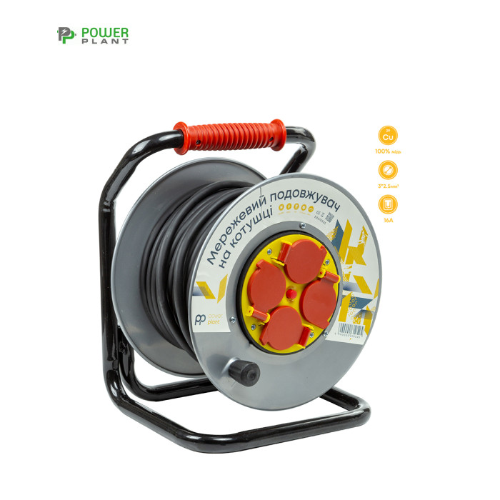 Подовжувач на котушці дозволяє підключати пристрої у місцях, віддалених від стаціонарних розеток у побутових умовах експлуатації. Призначений для використання в електромережі 220 В, для живлення пристроїв з максимальною сумарною потужністю навантаження 3.5 кВт. Ізоляційний матеріал H05VV-F та провідники зі 100% міді гарантують високу стійкість до температур та механічних пошкоджень, а також максимальну електропровідність та стійкість до навантажень. Металева котушка забезпечує жорсткість та надійність конструкції, а гумове руків'я полегшує процес транспортування. Під час роботи невикористаний провід залишається у змотаному вигляді, що створює додатковий комфорт в експлуатації. Подовжувач оснащений 4 розетками євростандарту із захисними шторками. Надійний та зручний подовжувач захистить електронну техніку від короткого замикання та перепадів напруги. Подовжувач на котушці PowerPlant стане чудовим помічником у будинку, офісі або на дачі. Технічні характеристики:Назва: Подовжувач на котушці PowerPlant 25 м, 3x2.5 мм², 16A, 4 розетки, 100% мідь (JY-20022/25).