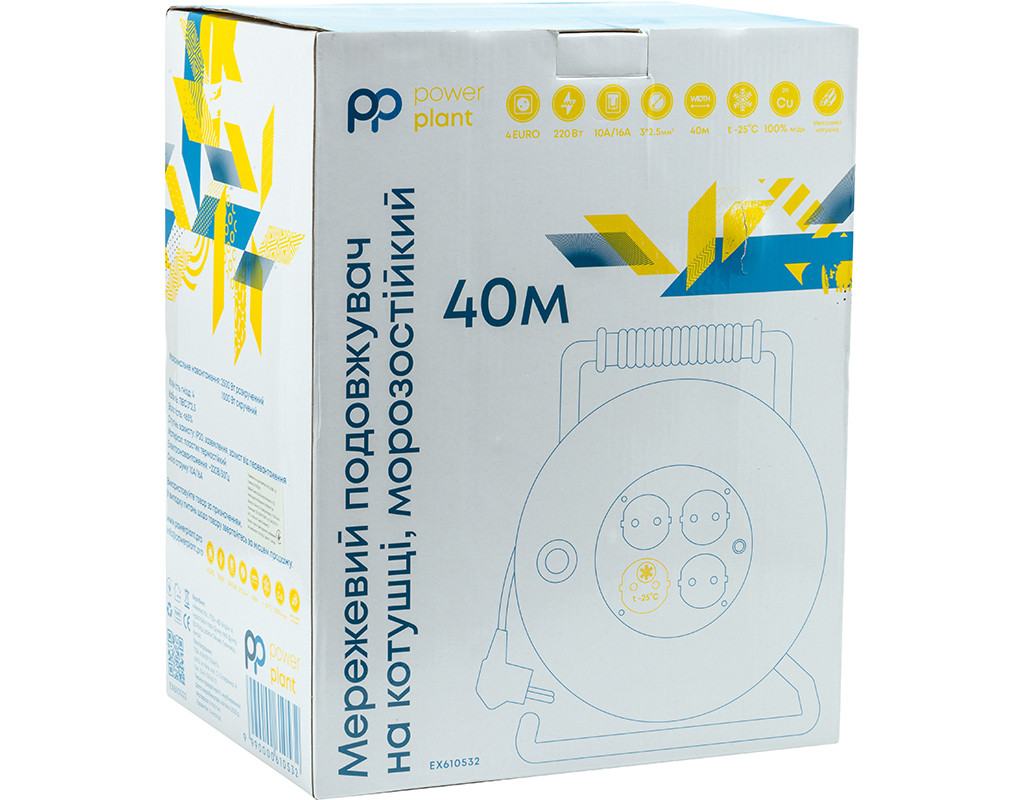 Подовжувач на котушці дозволяє підключати пристрої у місцях, віддалених від стаціонарних розеток у побутових умовах експлуатації. Призначений для використання в електромережі 220 В, для живлення пристроїв з максимальною сумарною потужністю навантаження 3.5 кВт. Ізоляційний матеріал H05VV-F та провідники зі 100% міді гарантують високу стійкість до температур та механічних пошкоджень, а також максимальну електропровідність та стійкість до навантажень. Металева котушка забезпечує жорсткість та надійність конструкції, а гумове руків'я полегшує процес транспортування. Під час роботи невикористаний провід залишається у змотаному вигляді, що створює додатковий комфорт в експлуатації. Подовжувач оснащений 4 розетками євростандарту із захисними шторками. Надійний та зручний подовжувач захистить електронну техніку від короткого замикання та перепадів напруги. Подовжувач на котушці PowerPlant стане чудовим помічником у будинку, офісі або на дачі. Технічні характеристики: