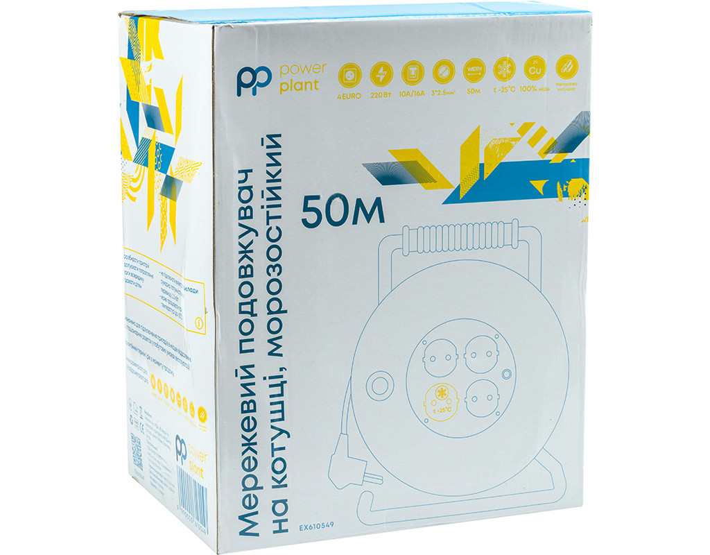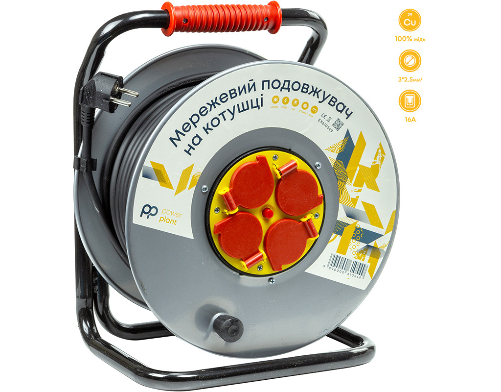 Подовжувач на котушці дозволяє підключати пристрої у місцях, віддалених від стаціонарних розеток у побутових умовах експлуатації. Призначений для використання в електромережі 220 В, для живлення пристроїв з максимальною сумарною потужністю навантаження 3.5 кВт. Ізоляційний матеріал H05VV-F та провідники зі 100% міді гарантують високу стійкість до температур та механічних пошкоджень, а також максимальну електропровідність та стійкість до навантажень. Металева котушка забезпечує жорсткість та надійність конструкції, а гумове руків'я полегшує процес транспортування. Під час роботи невикористаний провід залишається у змотаному вигляді, що створює додатковий комфорт в експлуатації. Подовжувач оснащений 4 розетками євростандарту із захисними шторками. Надійний та зручний подовжувач захистить електронну техніку від короткого замикання та перепадів напруги. Подовжувач на котушці PowerPlant стане чудовим помічником у будинку, офісі або на дачі. Технічні характеристики: