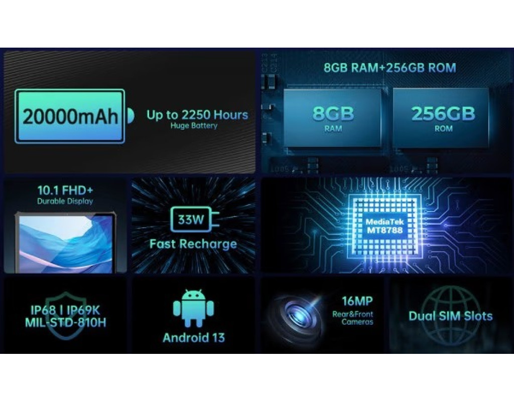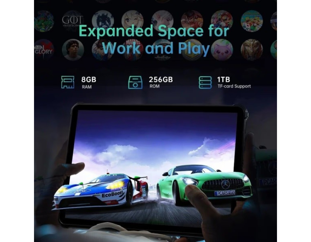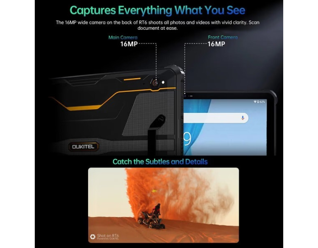 Дисплей має такі параметри: 11 дюймів; 2к дозвіл; IPS-матриця. Користувач зможе відчути всю гамму кольорів та насолодитися чудовим зображенням на екрані пристрою Оукітел РТ8. Особливу увагу слід приділити наявності додаткового власника, що значно покращує переносимість пристрою. Продуктивність вміє вражати, тому що відповідає 8-ядерний процесор MediaTek Helio G99 та оперативна пам’ять 6+6 ГБ. Цей набір характеристик забезпечує можливість грати в популярні ігри та насолоджуватись переглядом кінокартини на високому рівні. З вбудованою пам’яттю в 256 ГБ, цей планшет стає ще зручнішим, тому що можна використовувати його як потужну флешку для зберігання даних та передачі їх на інші пристрої. Основна камера з роздільною здатністю 48+20+5-Мп чудово справляється з фотографуванням як вдень, так і вночі. Це ідеальний вибір для тих, хто цінує мистецтво фотографії та прагне створювати якісні знімки у будь-яких умовах. Фронтальна камера роздільною здатністю 32-Мп призначена для створення дивовижних селфі, які вразять ваших друзів. Потужний, потужний акумулятор ємністю 20 000 мАг створений для тривалої автономної роботи. Видно, що виробники шкірну деталь, щоб користувач міг довго насолоджуватися Oukitel RT8 |