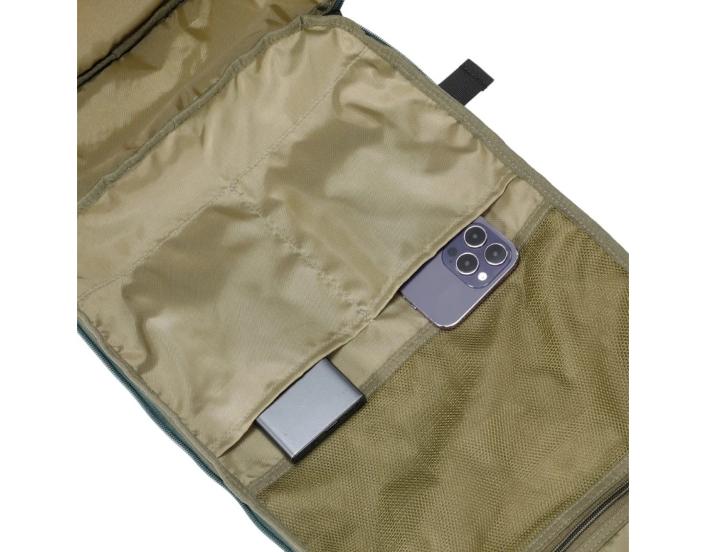 - У рюкзаку є: 1 зовнішня кишеня на блискавці і з двома пластиковими застібками; бічна кишеня; 1 велике відділення на блискавці: всередині великого відділення передбачена кишеня з сітчастої тканини, що закривається на блискавку, а також 2 внутрішніх кишені для дрібних речей, смартфона або гаманця; 1 відділення на блискавці для ноутбука.
