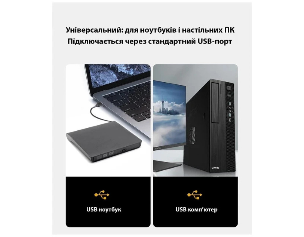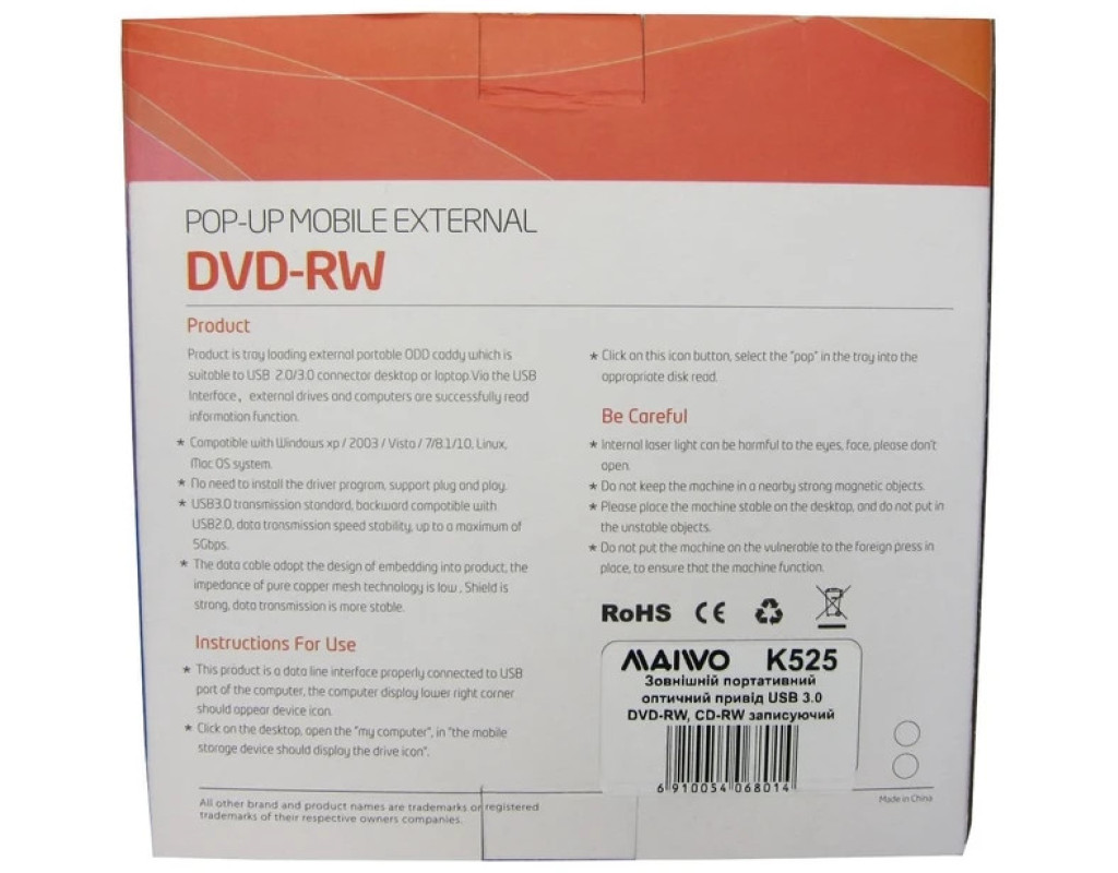 Зовнішній оптичний привід Maiwo USB DVD±R/RW, CD-RW або портативний дисковод підключається до ноутбуків і настільних комп’ютерів через стандартний USB-порт і не потребує встановлення додаткових драйверів чи програмного забезпечення. З його допомогою ви зможете архівувати та зберігати відеозаписи, фотографії, дані та музику на CD або DVD-дисках. Портативний дисковод K525 відтворює та записує дані на всі типи CD та DVD-дисків, працює тихо. Має компактні габарити — 146x143x18 мм, живиться від будь-якого джерела з USB-роз'ємом. Оптичний привід надійно стоїть на столі, а прогумовані ніжки на нижній частині корпусу запобігають його ковзанню по поверхні. Технічні характеристики: