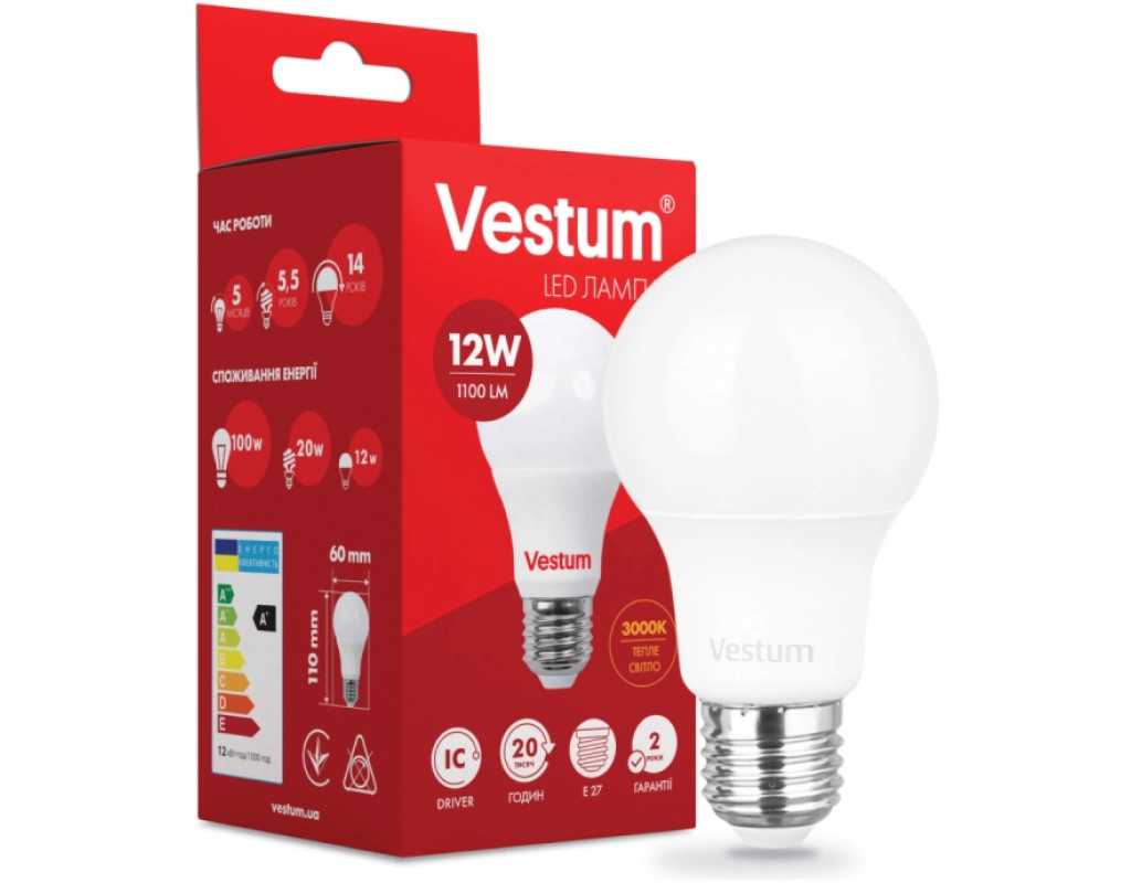 Світлодіодна лампа Vestum 1-VS-1104 потужністю 12 Вт дає 1100 Лм. Споживаючи в рази менше електрики, ніж лампи розжарювання або люмінесцентні лампи, вона дає таку ж кількість світла і прослужить в кілька разів довше. Лампа має тепле світло, що робить її придатною для спалень, дитячих та настільних ламп. Стандартний цоколь E27 підходить для люстр, торшерів, настільних ламп і настінних світильників.