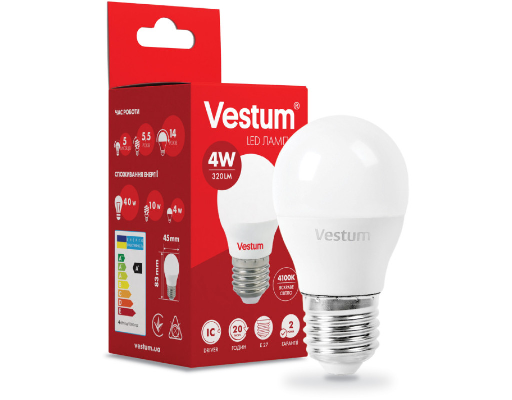 Світлодіодна лампа Vestum 1-VS-1205 потужністю 4 Вт дає 320 Лм. Споживаючи в рази менше електрики, ніж лампи розжарювання або люмінесцентні лампи, вона дає таку ж кількість світла і прослужить в кілька разів довше. - Лампа має тепле світло, що робить її підходить для