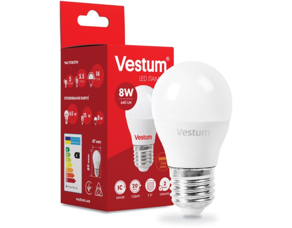 Світлодіодна лампа Vestum 1-VS-1210 потужністю 8 Вт дає 640 Лм. Споживаючи в рази менше електрики, ніж лампи розжарювання або люмінесцентні лампи, вона дає таку ж кількість світла і прослужить в кілька разів довше. - Лампа має тепле світло, що робить її підходить для
