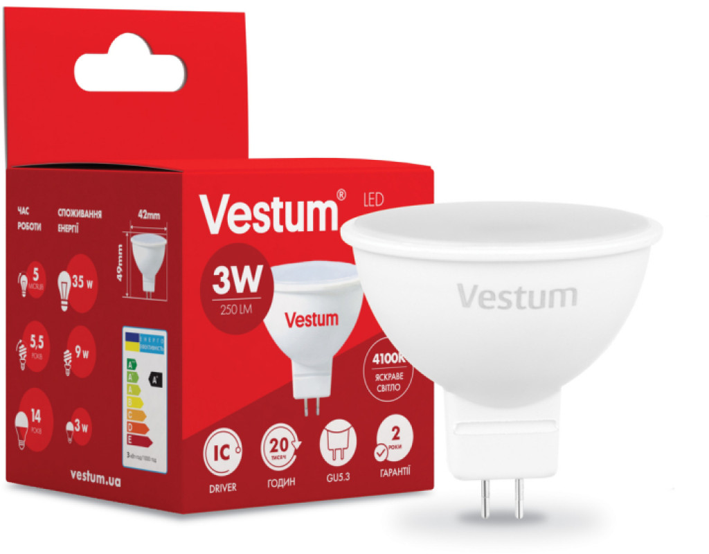 Vestum 1-VS-1501 потужністю 3 Вт дає 250 Лм. Споживаючи в рази менше електрики, ніж лампи розжарювання або люмінесцентні лампи, вона дає таку ж кількість світла і прослужить в кілька разів довше.