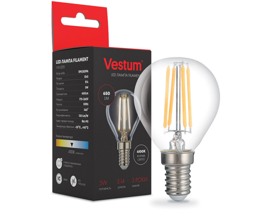 Світлодіодна філаментна лампа Vestum 1-VS-2229 потужністю 5 Вт видає 650 Лм. Споживаючи стільки ж електрики, як і звичайні світлодіодні лампи, філаментні лампи дають в рази більше світла. Філаментна лампа Vestum має нейтральне біле світло, що робить її придатною для вітальні, кухні, передпокою і інших приміщень. Стандартний цоколь E14 підходить для люстр, торшерів, настільних і настінних світильників.