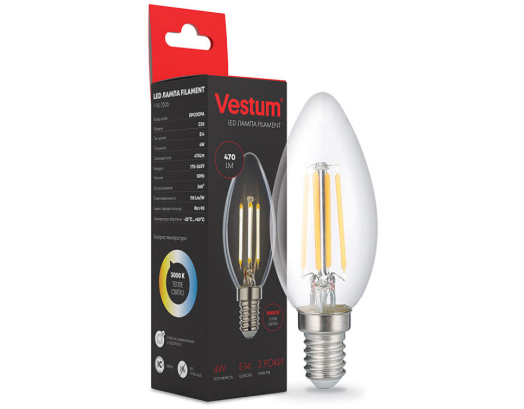 Світлодіодна філаментна лампа Vestum 1-VS-2306 потужністю 4 Вт видає 500 Лм. Споживаючи стільки ж електрики, як і звичайні світлодіодні лампи, філаментні лампи дають в рази більше світла. - Філаментна лампа Vestum