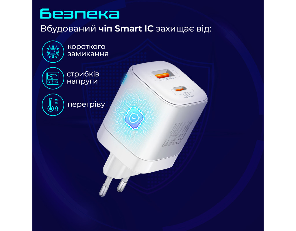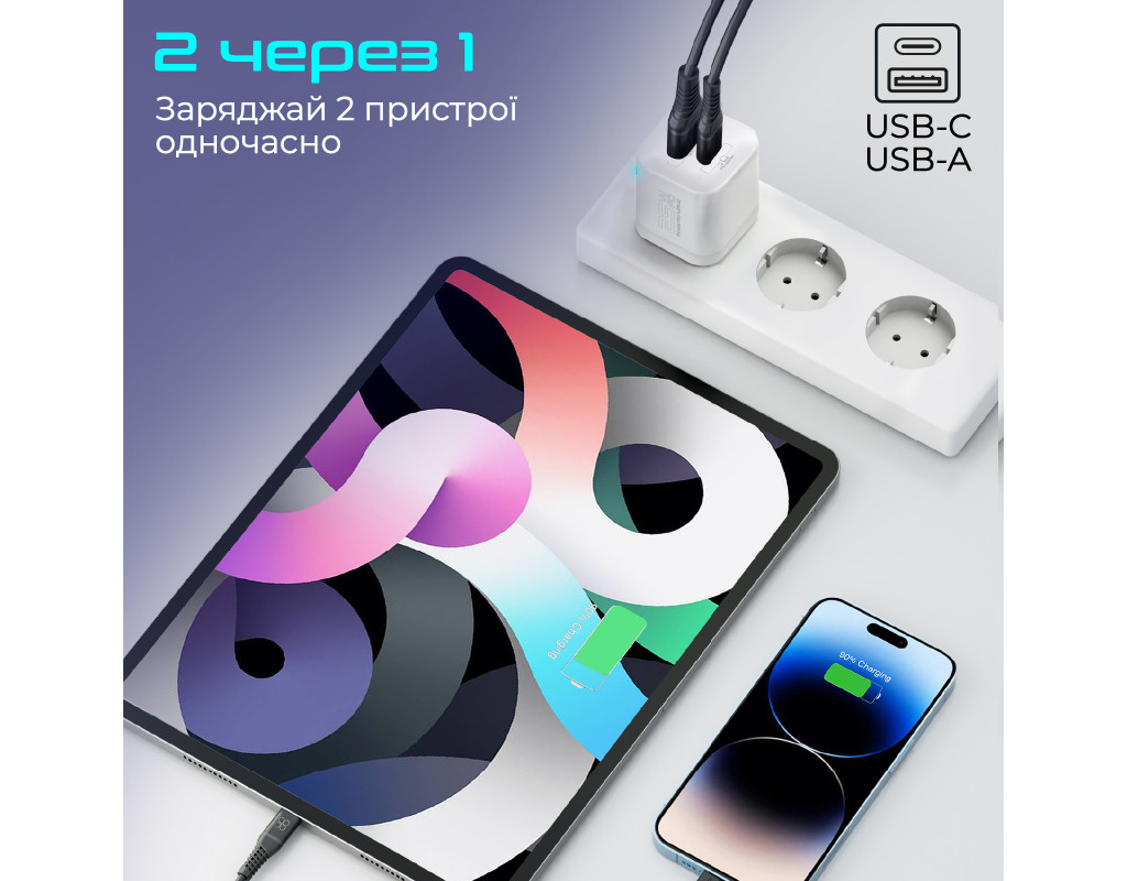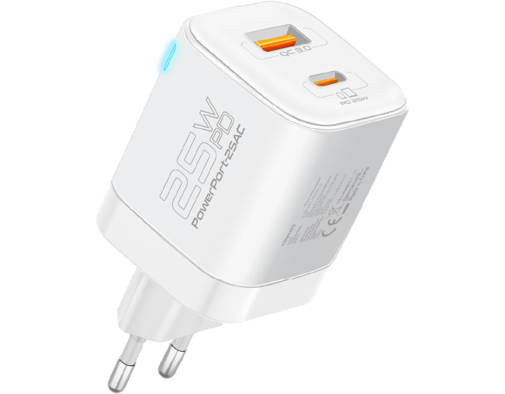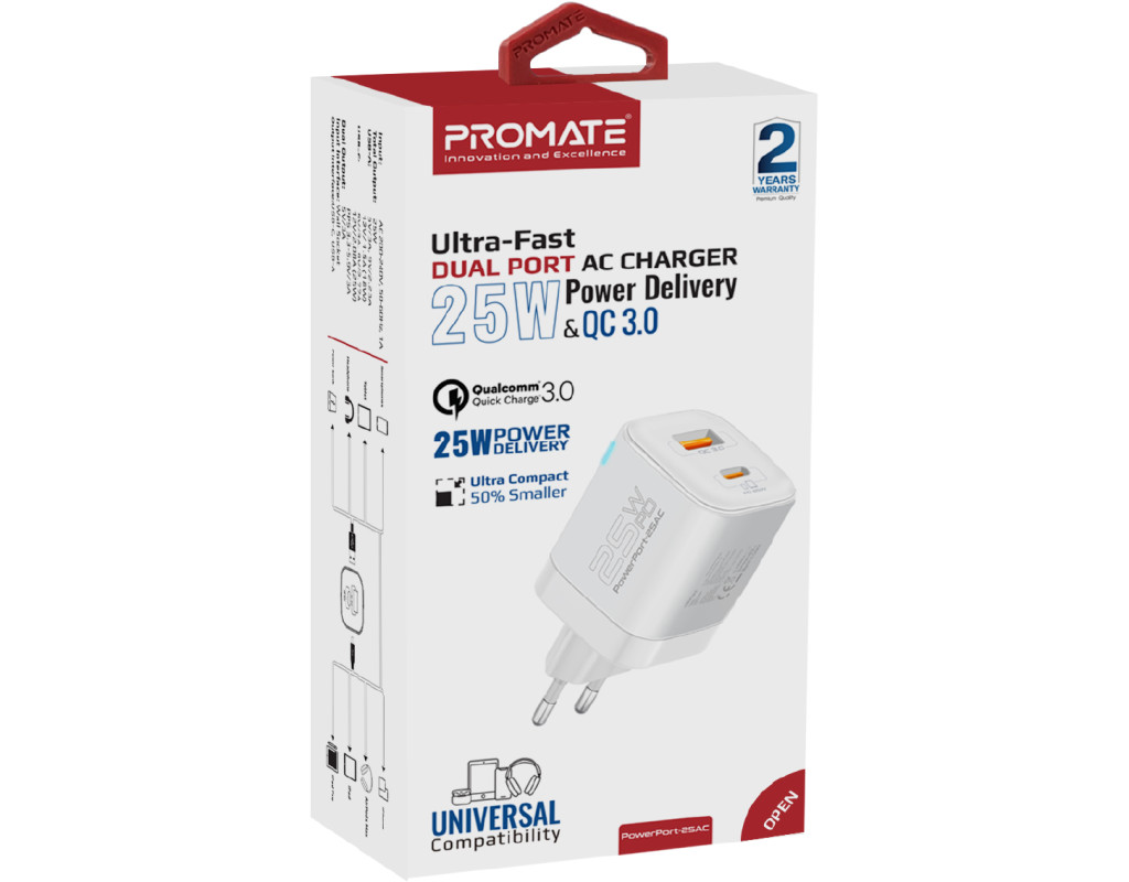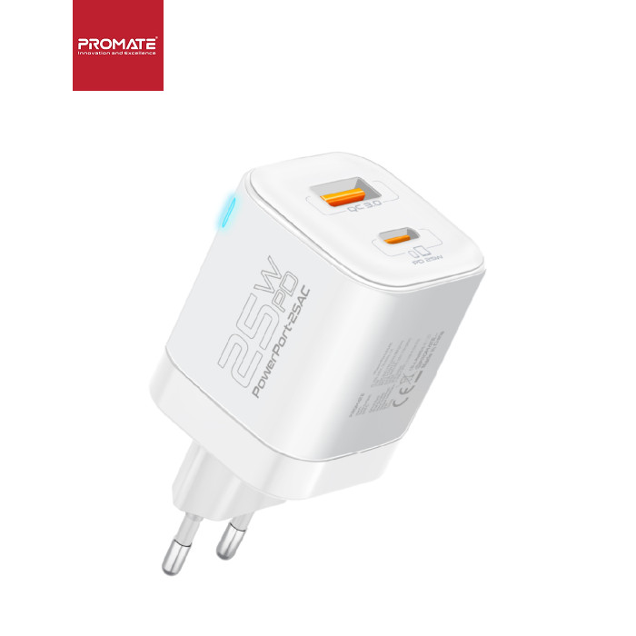 | Підтримка технологій Power Delivery та Quick Charge 3.0, максимальна безпека та ультракомпактний форм-фактор. Promate PowerPort-25AC з легкістю зарядить будь-який гаджет на потужності 25W через USB-C та USB-A порт.