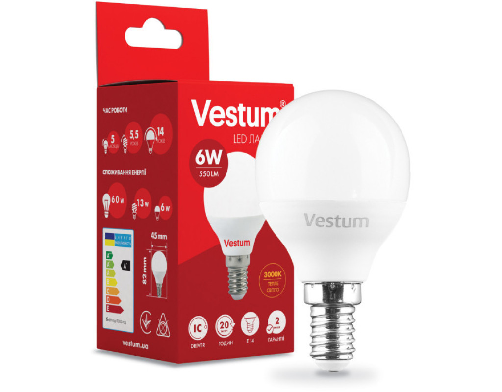 Світлодіодна лампа Vestum 1-VS-1204 потужністю 6 Вт дає 550 Лм. Споживаючи в рази менше електрики, ніж лампи розжарювання або люмінесцентні лампи, вона дає таку ж кількість світла і прослужить в кілька разів довше. - Лампа має тепле світло, що робить її підходить для