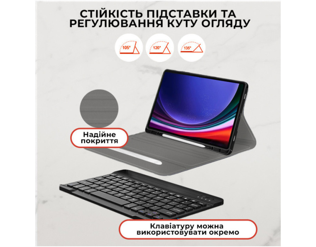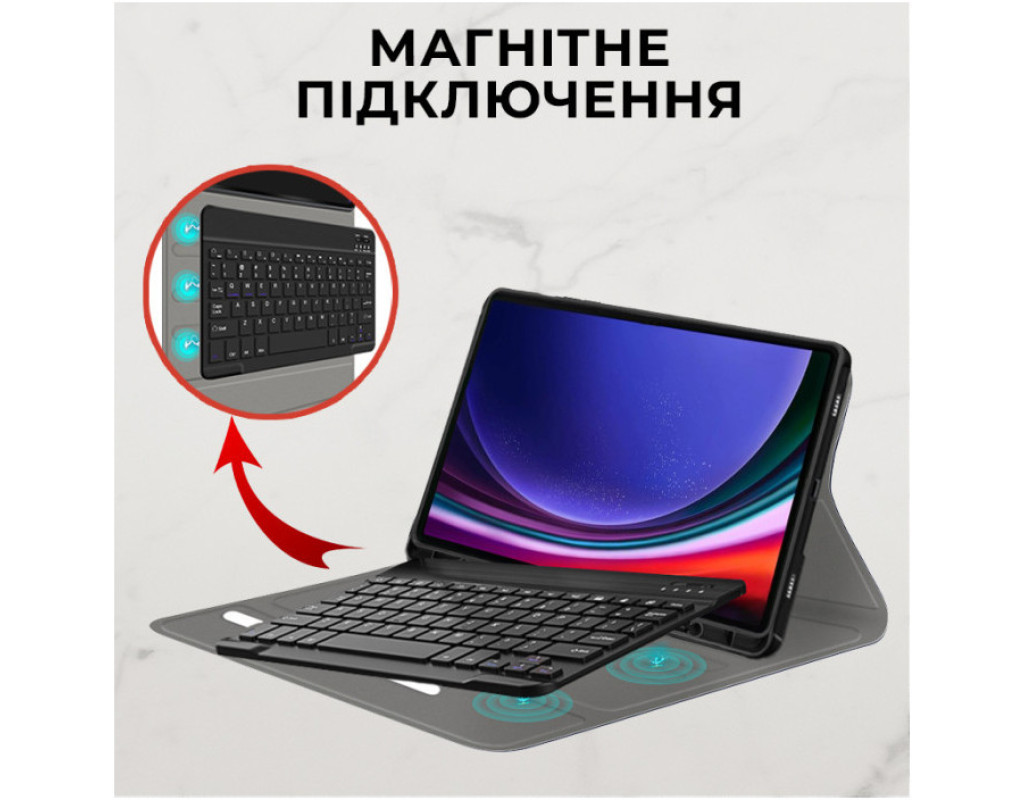 Тип - чохол-клавіатура, Сумісність з моделями - Samsung Galaxy Tab S9 Plus, діагональ - 12.4, Спосіб кріплення - обкладинка, спосіб закриття - магніт, Матеріал - поліуретан, чорний